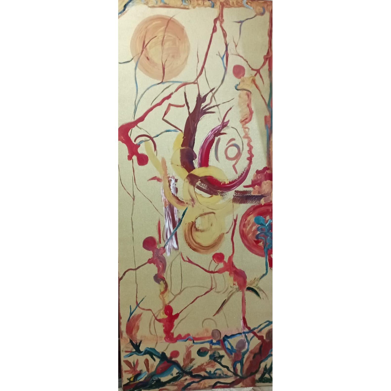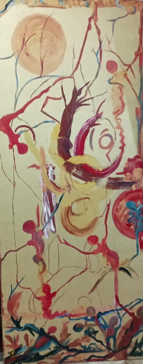 L’ho chiamato così perché è una contraddizione. Come lavita. Cadi, ma mentre cadi sali. Ti rompi, ma mentre ti rompi ti apri.Vediqueste figure rosse? Stanno precipitando, ma guardale bene: hanno le braccia aperte.Non si aggrappano. Si lasciano andare. Perché a un certo punto ho capito cheresistere alla caduta fa più male che cadere. Le vene, i fili rossi e blu chele attraversano, sono quello che ci tiene legati. Ai traumi, agli altri, alpassato. Ma sono anche radici. E le radici vanno giù prima di spingerti su.Quelsole in alto non è salvezza. È indifferente. C’è sempre stato, anche mentre iocrollavo. I cerchi gialli al centro sono i cicli. Cadi, ti rialzi, ricadi,risali. Ogni volta perdi un pezzo ma ne guadagni uno nuovo. Quello che sembraun “6” rovesciato è il mio numero di vite. Non lo so più a che punto sono.Ilfondo è oro sporco. Perché la caduta non è buia. È luminosa, a volte. Tispoglia di tutto, e nella nudità trovi una luce che prima non vedevi. Il bluche spunta è il fiato. Poco, ma c’è. Basta per il prossimo movimento.L’hodipinto quando ho smesso di avere paura di toccare il fondo. Perché il fondonon è la fine. È il punto in cui smetti di fingere. È dove inizi a salire, manon verso l’alto che pensavi tu. Sali dentro. Sali verso una versione di te chenon cade più allo stesso modo.Non è un quadro di disperazione. È un quadro difisica. Ogni caduta ha una spinta uguale e contraria. Ogni volta che la vita tibutta giù, da qualche parte ti sta lanciando.Questa è la mia caduta ascendente.Fa schifo mentre succede. Ma dopo, ti accorgi che sei più in alto di prima.