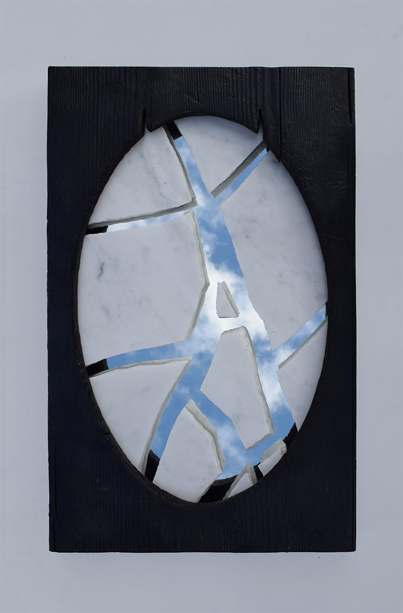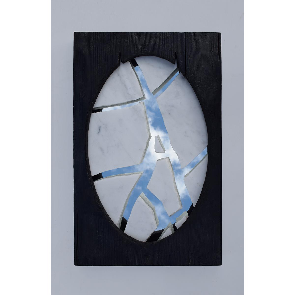 attraverso le spaccature del marmo bloccate sullo specchio da una cornice di legno bruciato ognuno può vedere riflessa la propria immagine frammentata che a volte emerge, altre volte sprofonda allinterno dell'opera.