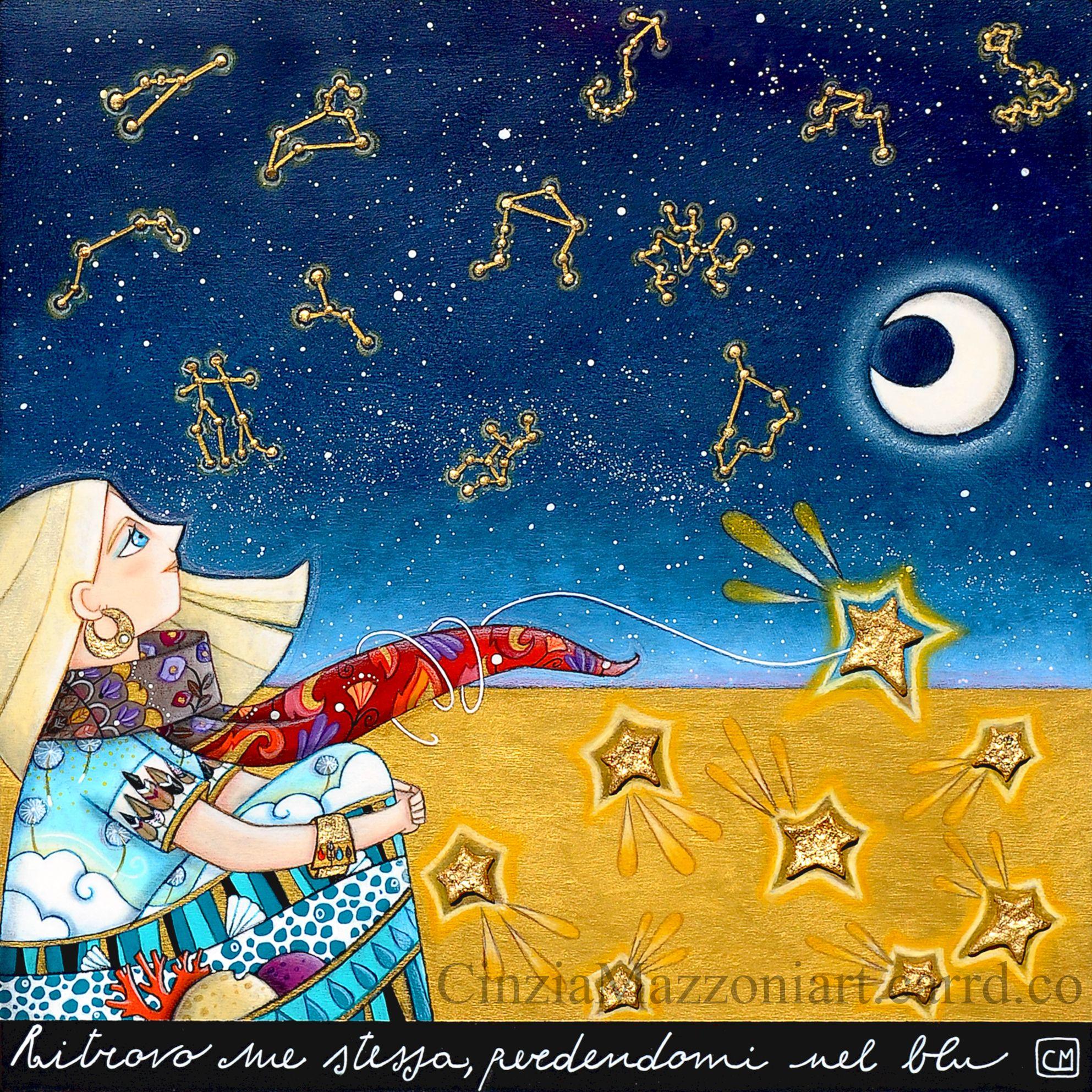 Opera unica dipinta a mano, realizzata con colori acrilici e foglia oro. L'immagine è stata utilizzata per la realizzazione della copertina del Calendario d'Autore per l'anno 2025, dove all'interno del calendario sono rappresentati mese per mese, tutti i segni zodiacali.