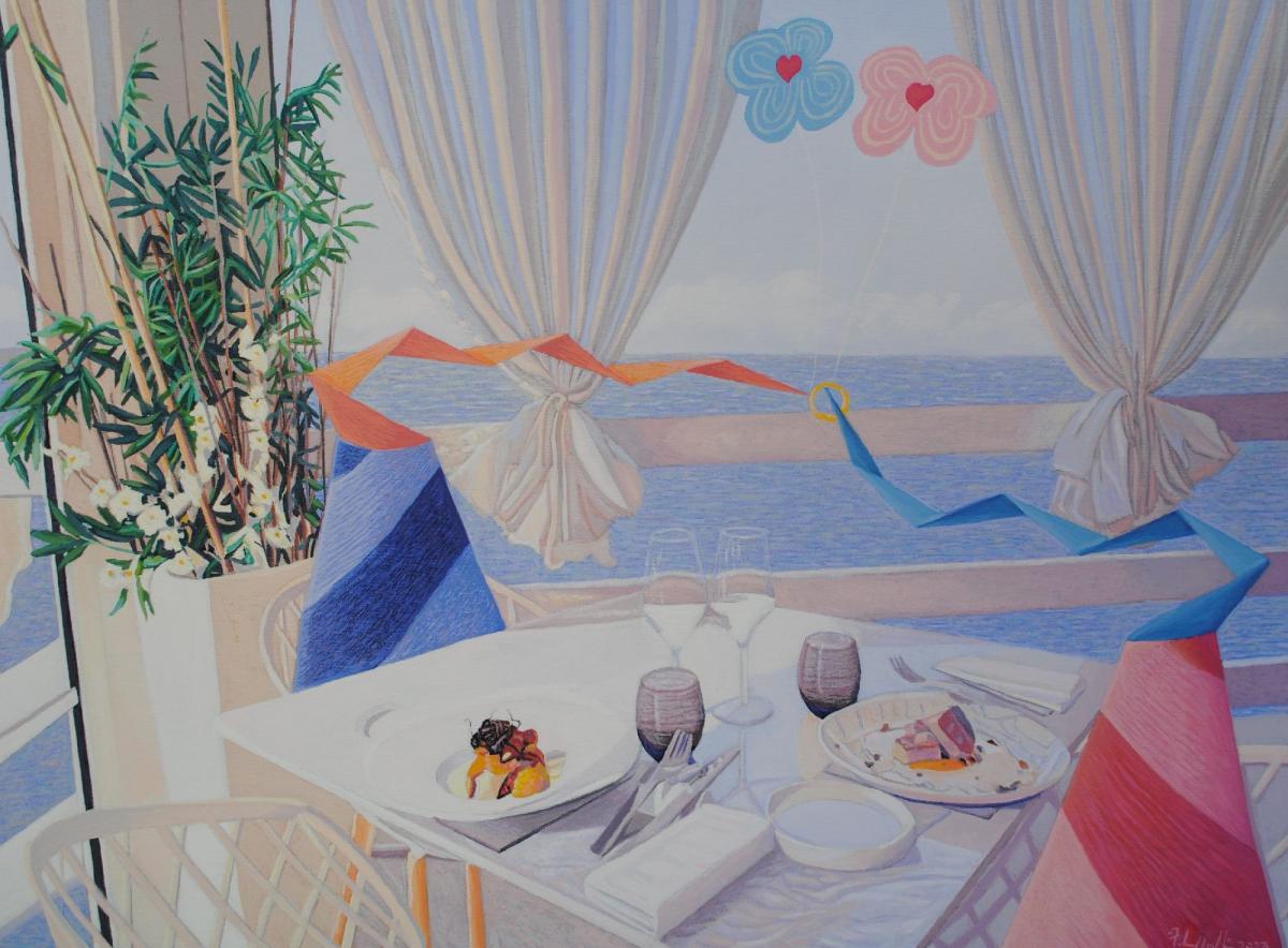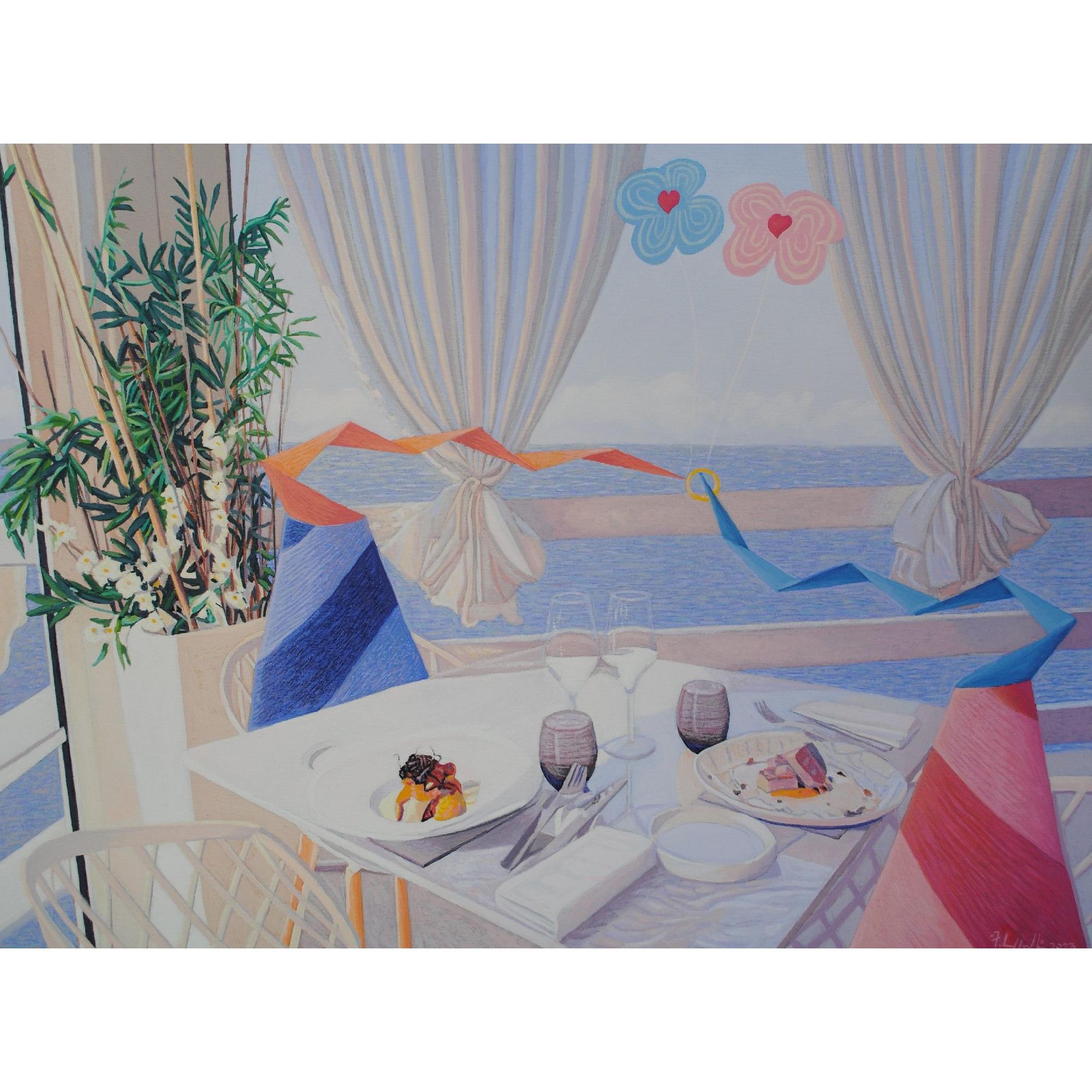 Due forme, maschile e femminile, sedute intorno ad un tavolo di un ristorante vicino al mare, che si fanno una promessa d'amore con un anello.