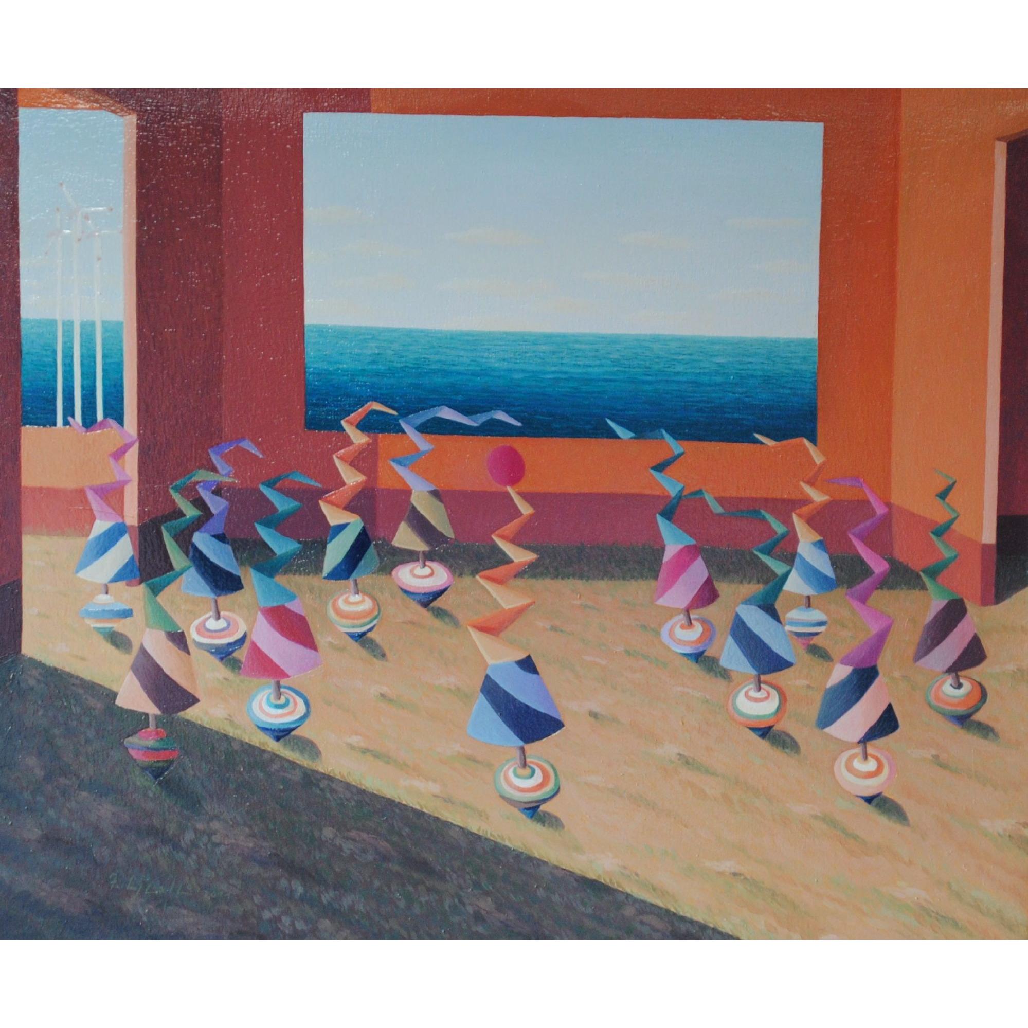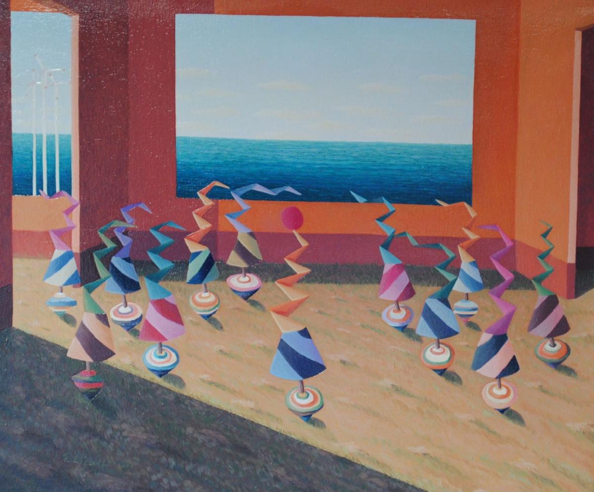 Forme simboliche che corrono su trottole in un ambiente metafisico. Rispecchia la vita quotidiana di ognuno di noi!..si corre sempre per tanti motivi e ci sfuggono i particolari semplici della vita!