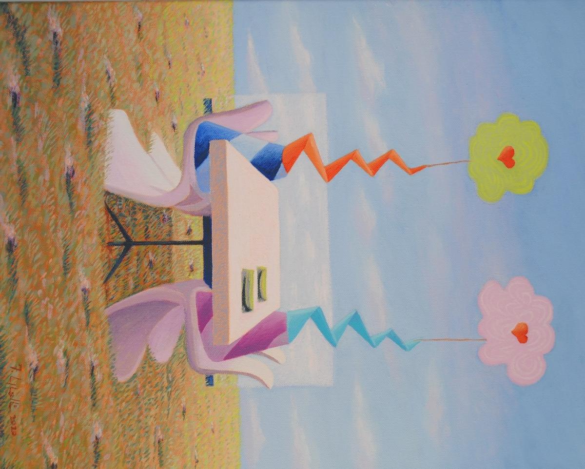 Una coppia di fidanzati seduti intorno ad un tavolo all'aria aperta in un contesto metafisico.I colori sono solari e si vedono le loro forme pensiero amorose.