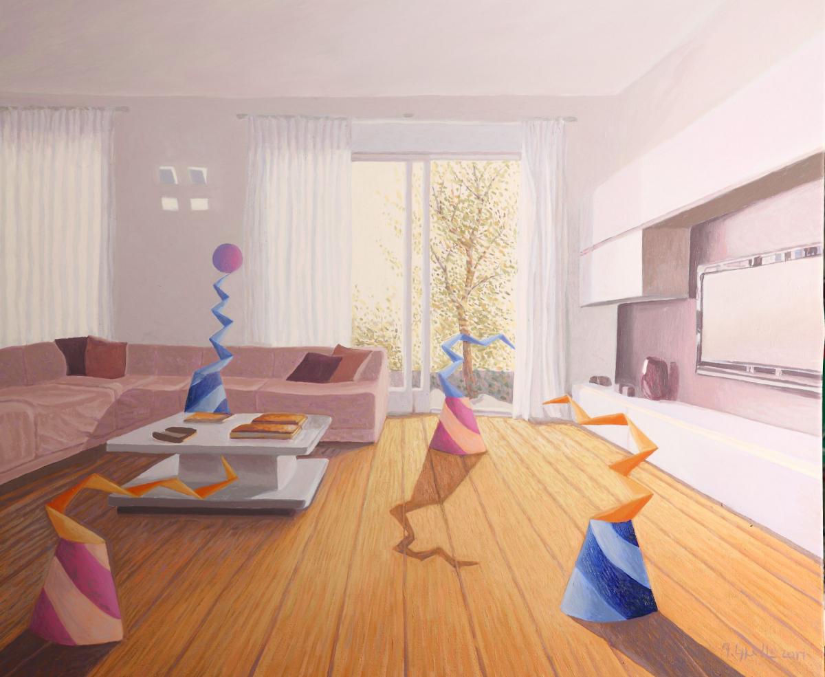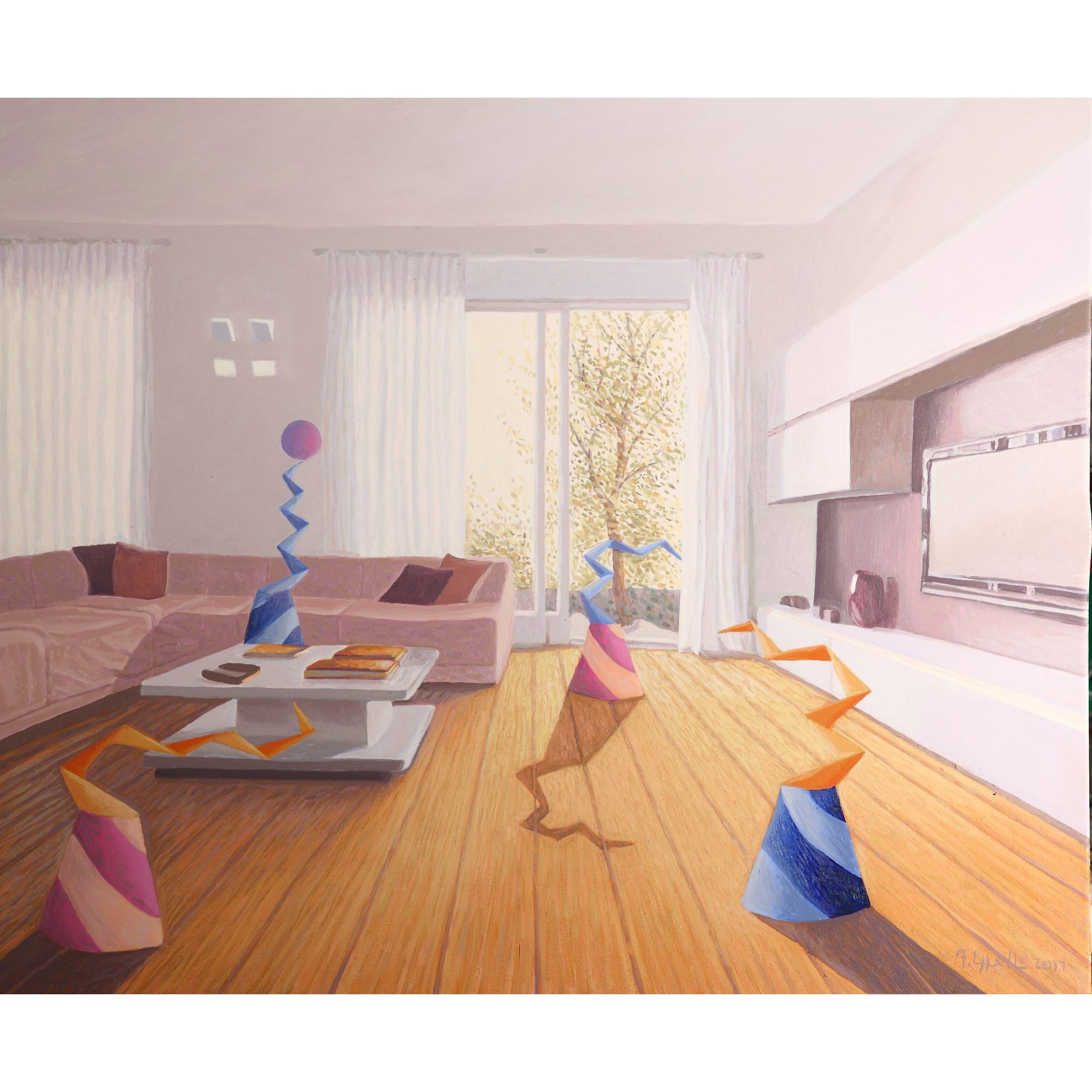 Un momento sereno in famiglia , con queste forme simboliche, inserite in un soggiorno di una casa moderna, illuminato dalla luce che penetra dalla finestra dove s'intravede fuori un albero .Colori pastello e luminosi.