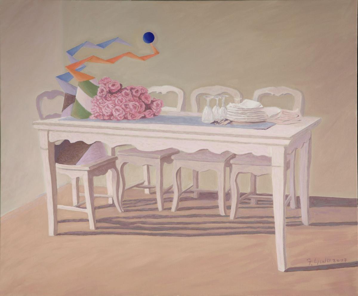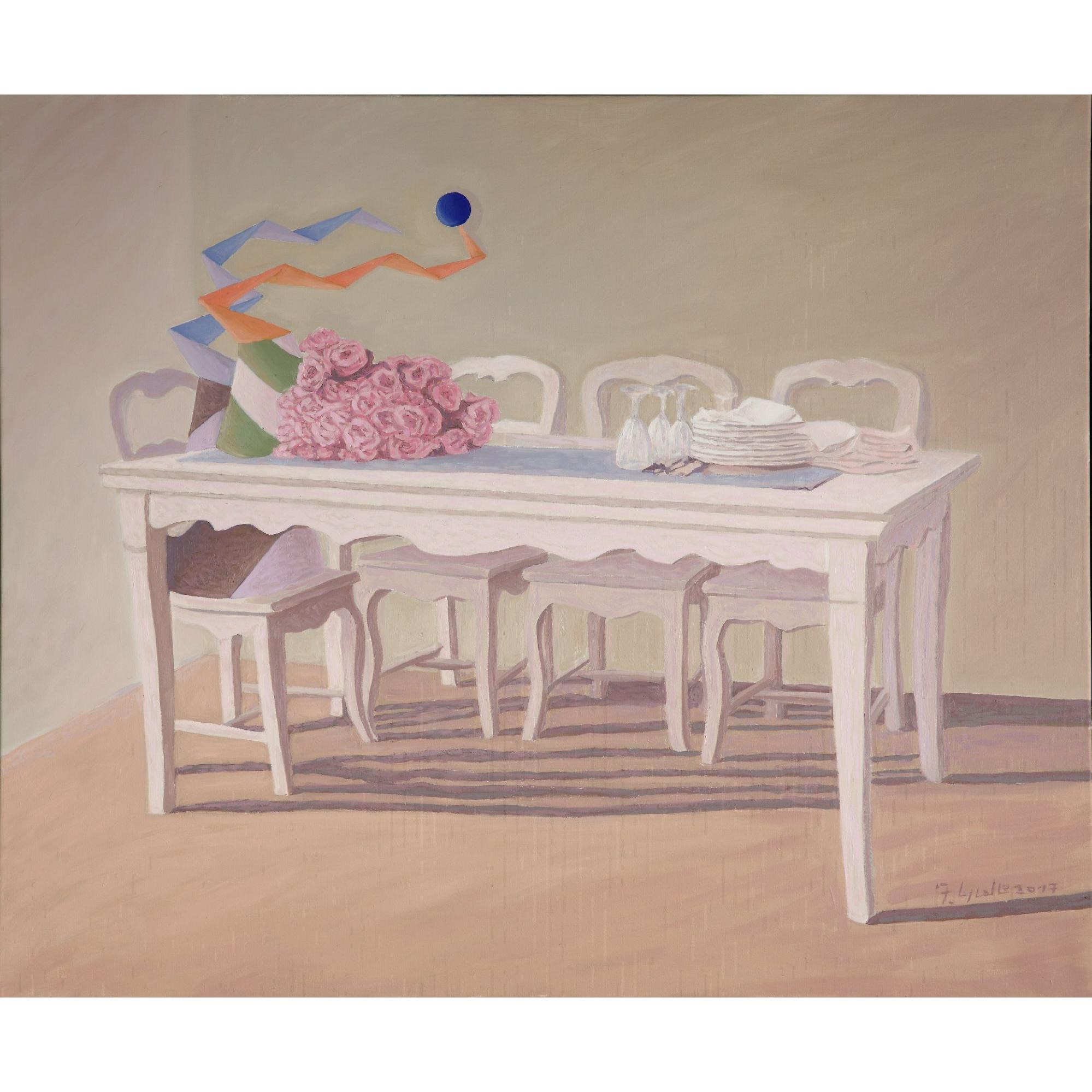 Momento metafisico..forme simboliche che sono in attesa di qualcosa o qualcuno. Colori ad olio trattati con tinte tenue e delicate.