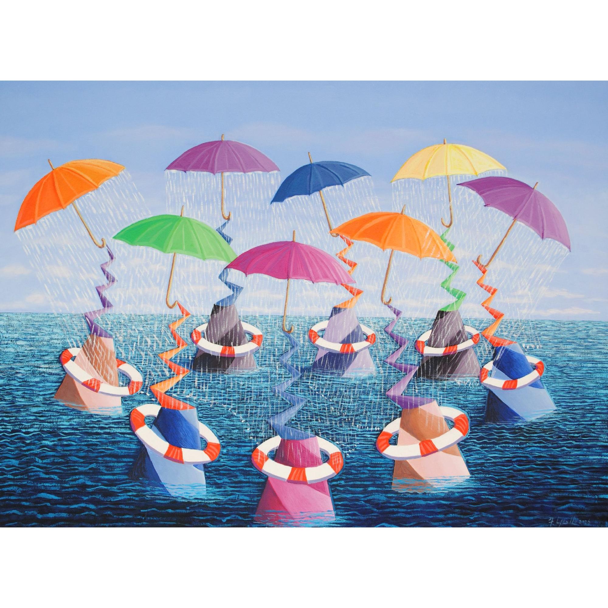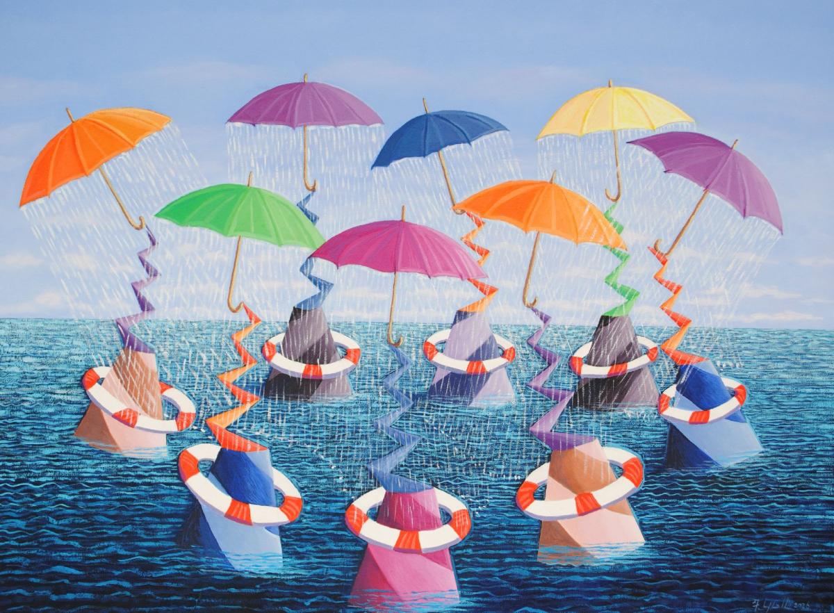 L'opera rappresenta delle forme coniche con delle lingue multicolori, piegate a zig zag. che sono in mezzo al mare con degli ombrelli, dai quali piove dal di sotto, nonostante il cielo sereno, e con degli salvagente. Nell'opera prevalgono le tonalità di azzurri, che trasmettono un messaggio di tranquillità, al contrario del titolo.