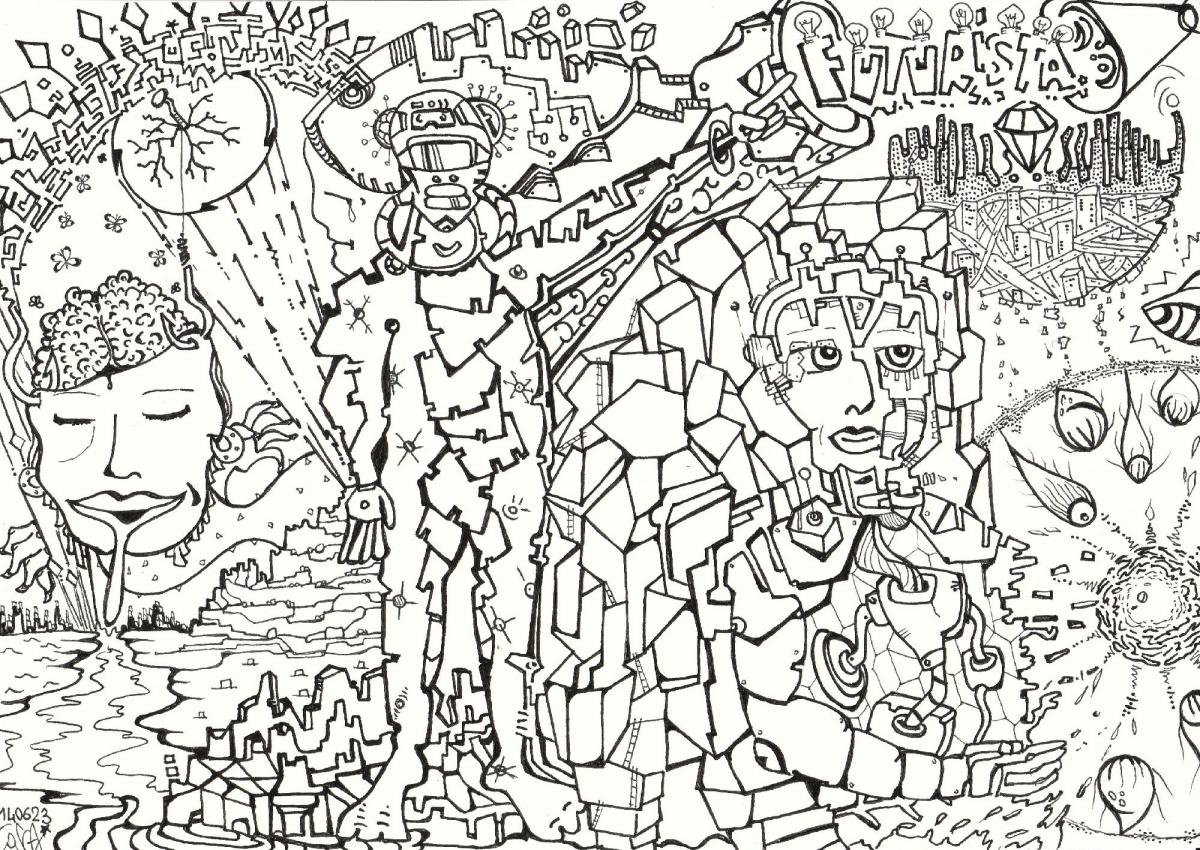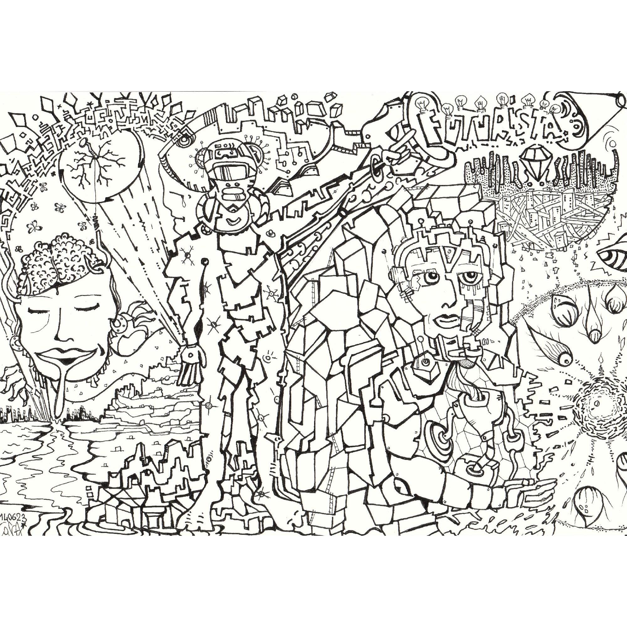 La trasformazione delle forme mutate dalla mano dell'uomo, l'evoluzione per alcuni e l'involuzione per altri, la scalata verso la città, la vita mondana, il divertimento, l'abbaglio dell'abbondanza senza la consapevolezza del deserto insito negli agglomerati. Quindi l'uomo che diventa ibrido, il cuore solo come pompa meccanica, il pensiero agganciato alla materia, al drago, fiumi di parole aride, tutti che sanno di tutti. Il tempo che risucchia prima o poi ogni cosa, ogni larva, ogni farfalla ma tutto cambia si trasforma. Futurista come visione, sensazione, presa di coscienza, speranza, tutta la matrice si disgrega, il buco nero attira, assorbe, divora tutto, poi rigenera e torna a brillare come una stella, una nuova vita ma ancora invisibile.