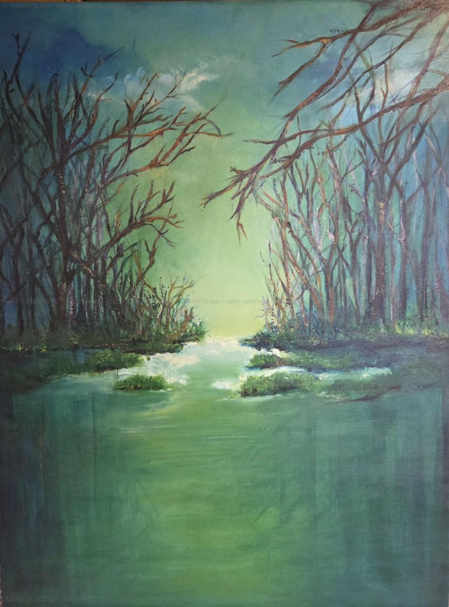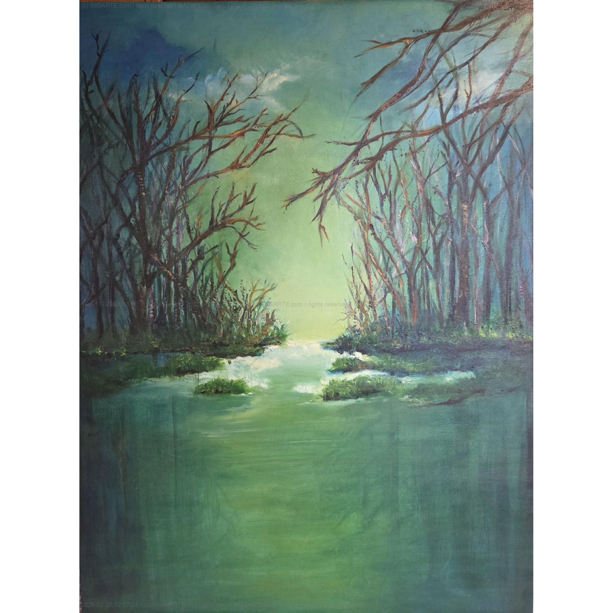 L'opera raffigura una distesa d'acqua calma che si insinua tra due sponde di alberi spogli, i cui rami intricati sembrano protendersi verso il centro della tela come dita silenziose. La palette cromatica è dominata da verdi acidi e tonalità salvia, che conferiscono alla scena un'atmosfera sospesa, quasi primordiale. La luce soffusa che emerge dallo sfondo crea un punto di fuga luminoso, trasformando lo specchio d'acqua in un sentiero verso l'ignoto. È un dipinto che gioca sul contrasto tra la fragilità dei rami secchi e la vitalità liquida del piano inferiore, evocando un senso di solitudine meditativa e rinascita.