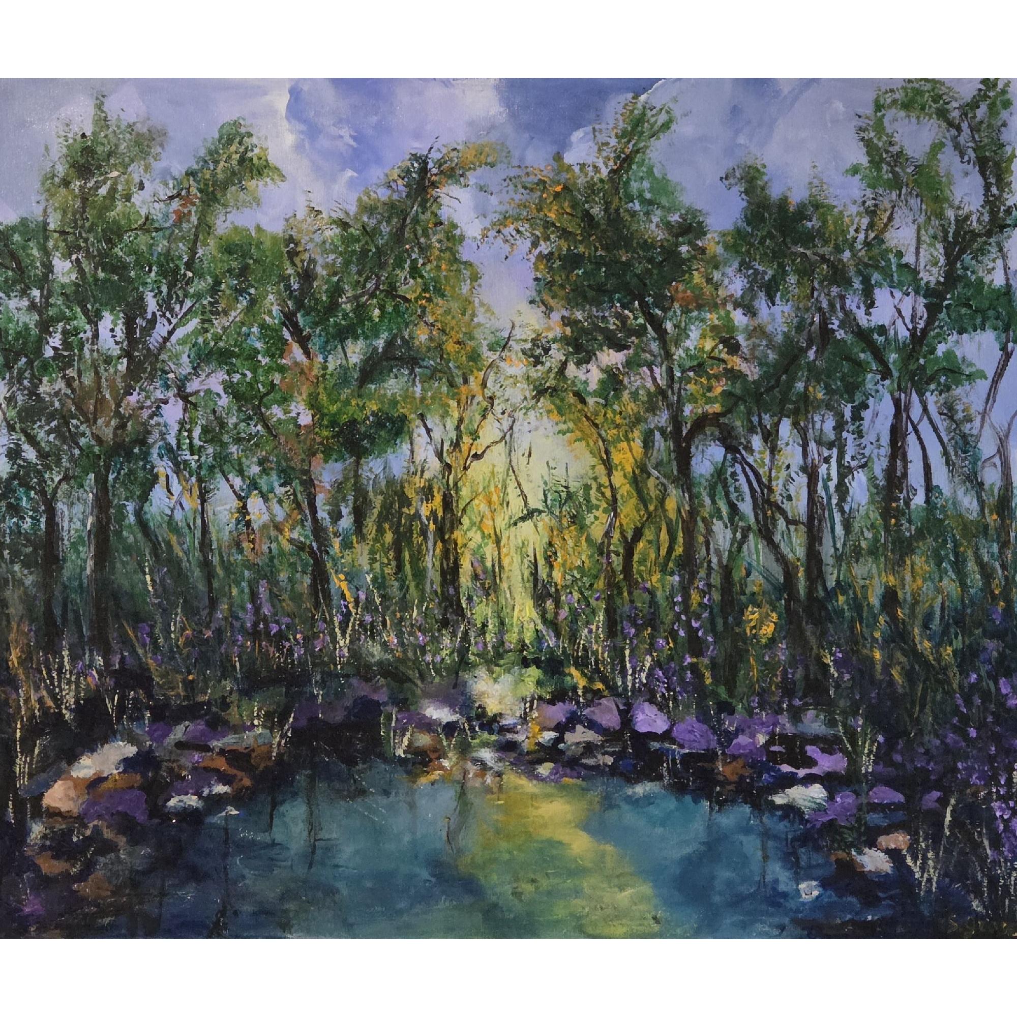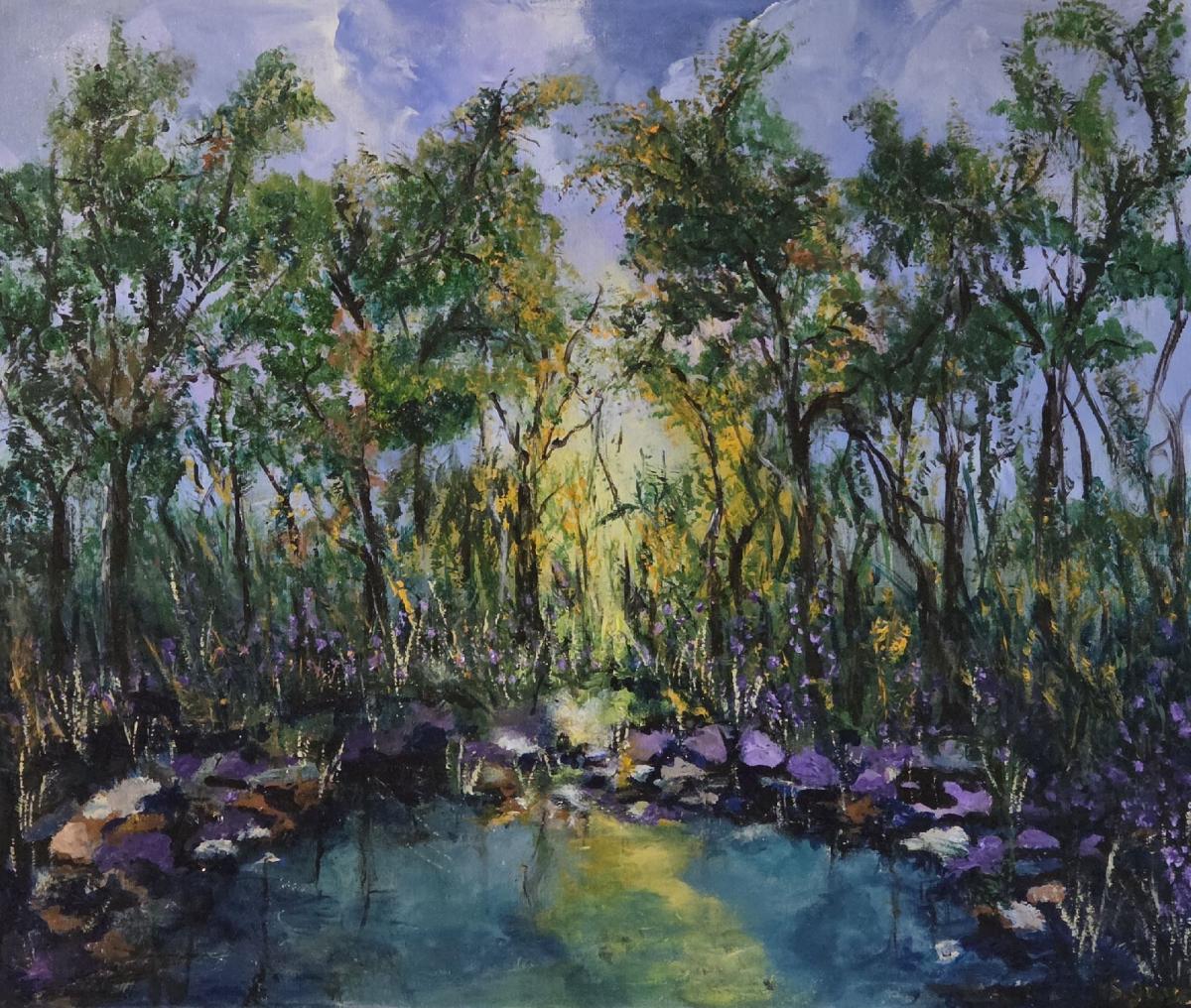 "Un’immersione cromatica dove i confini tra acqua e bosco sfumano in un gioco di pennellate decise. Questa opera celebra l’energia della natura attraverso una palette vivace di verde smeraldo, viola profondo e tocchi dorati, mentre sottili linee nere frammentano la scena come venature di una foglia o crepe nel tempo."