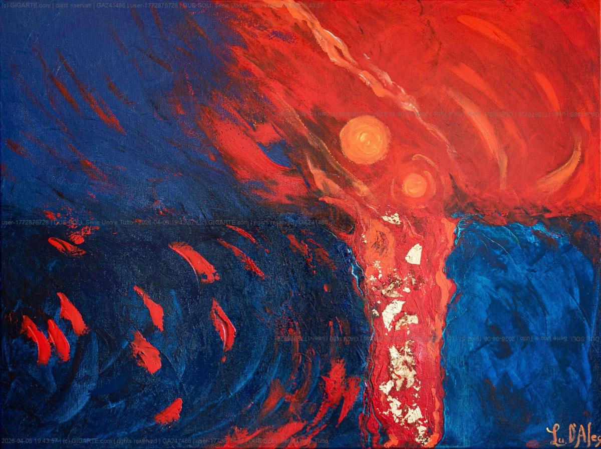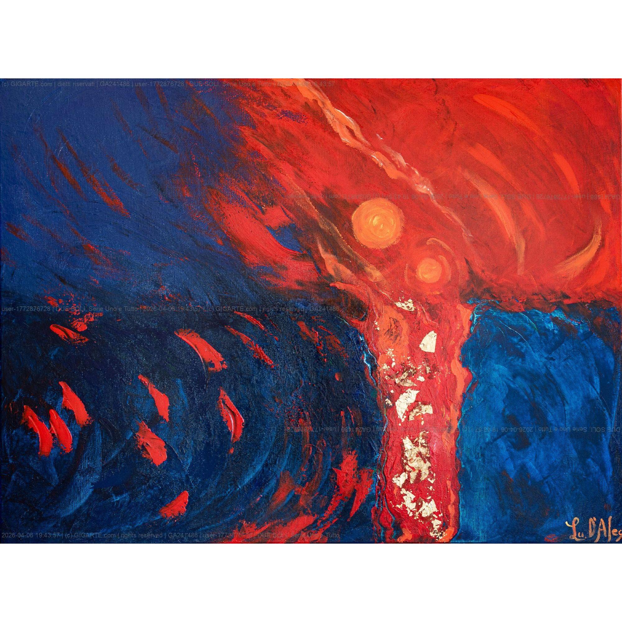 Due soli. Non uno — due. Come se l’universo avesse raddoppiato la sua forza, o come se esistesse un altro sistema solare dentro questo, nascosto nel rosso. Il mare non arretra: tiene. Il blu resiste al fuoco, e tra i due una colonna di luce non separa — connette. È il punto in cui gli opposti non si annullano ma si riconoscono. Due Soli appartiene alla serie Uno e Tutto: due fuochi, un’unica energia.