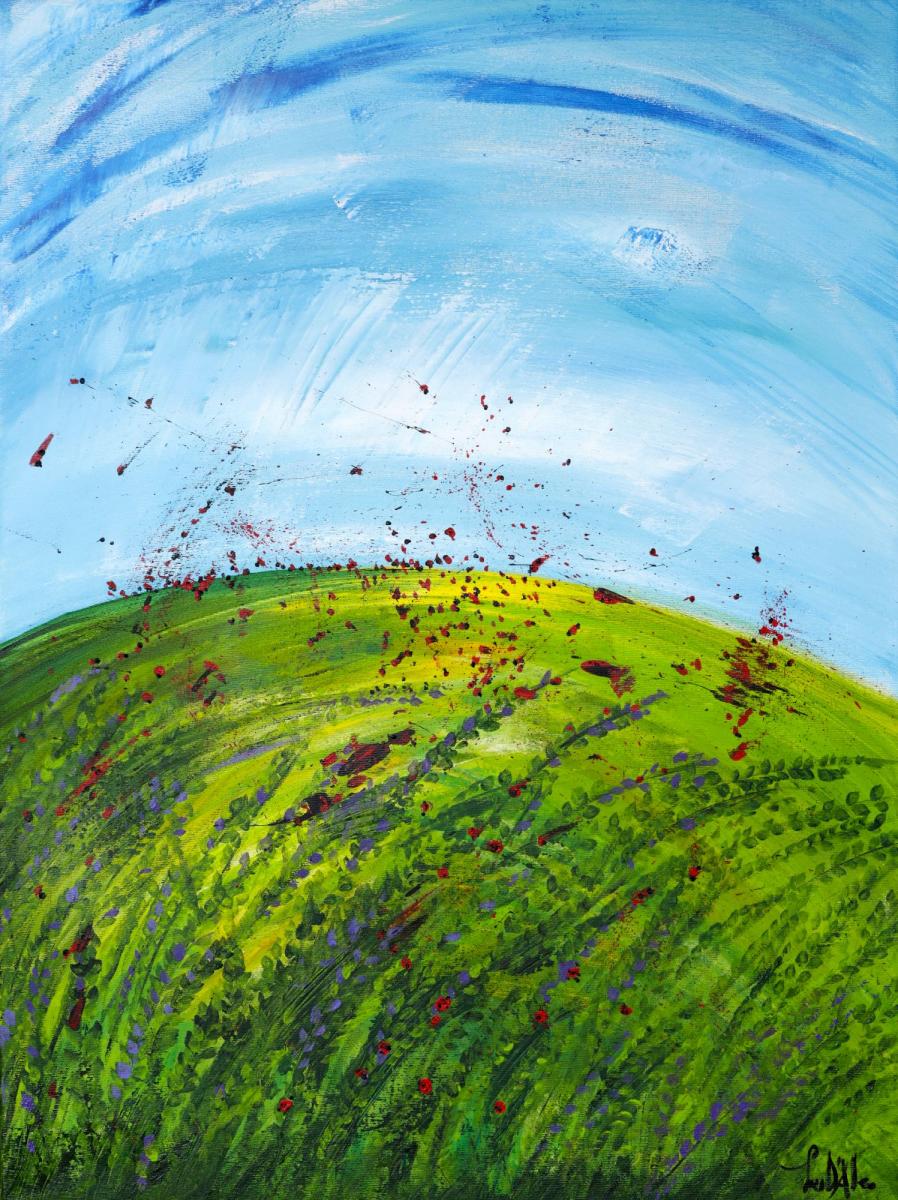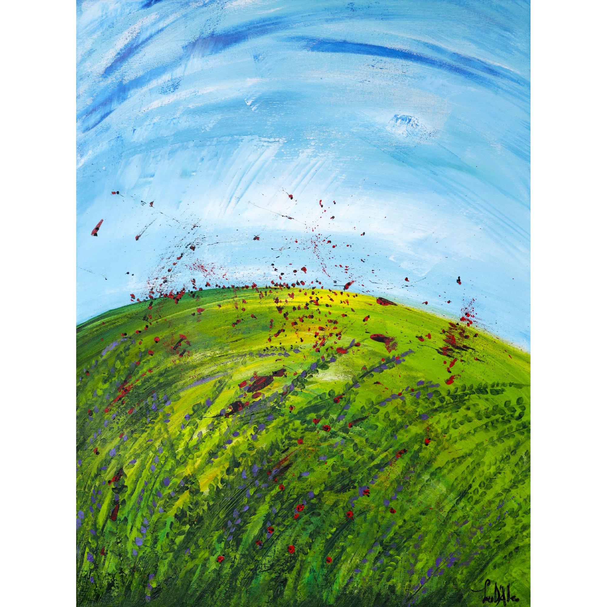 Un prato che sale verso il cielo, e il cielo che scende verso il prato. In mezzo, le coccinelle — puntini rossi che volano, cadono, si disperdono come semi o come gioia. Niente è fermo in quest’opera. La terra vibra, l’aria si muove, ogni elemento partecipa allo stesso respiro. Coccinelle appartiene alla serie Uno e Tutto: anche il più piccolo essere vivente è parte del sistema, anche il gesto più lieve conta.