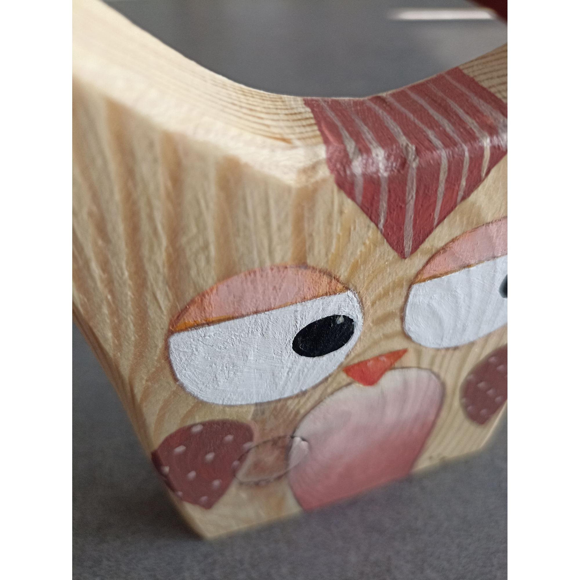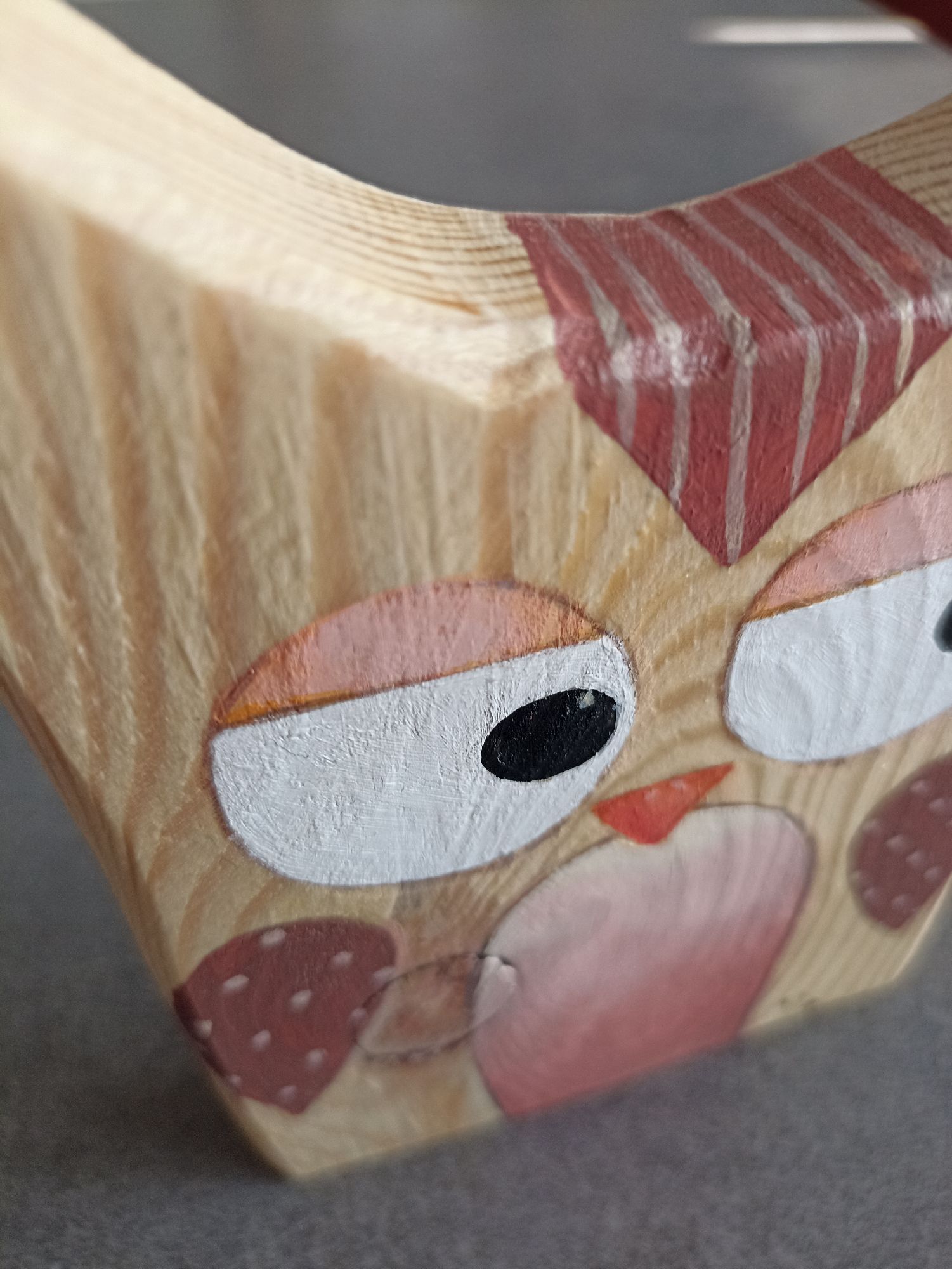 Oggetto artigianale dipinto a mano, legno naturale con venature e nodo.