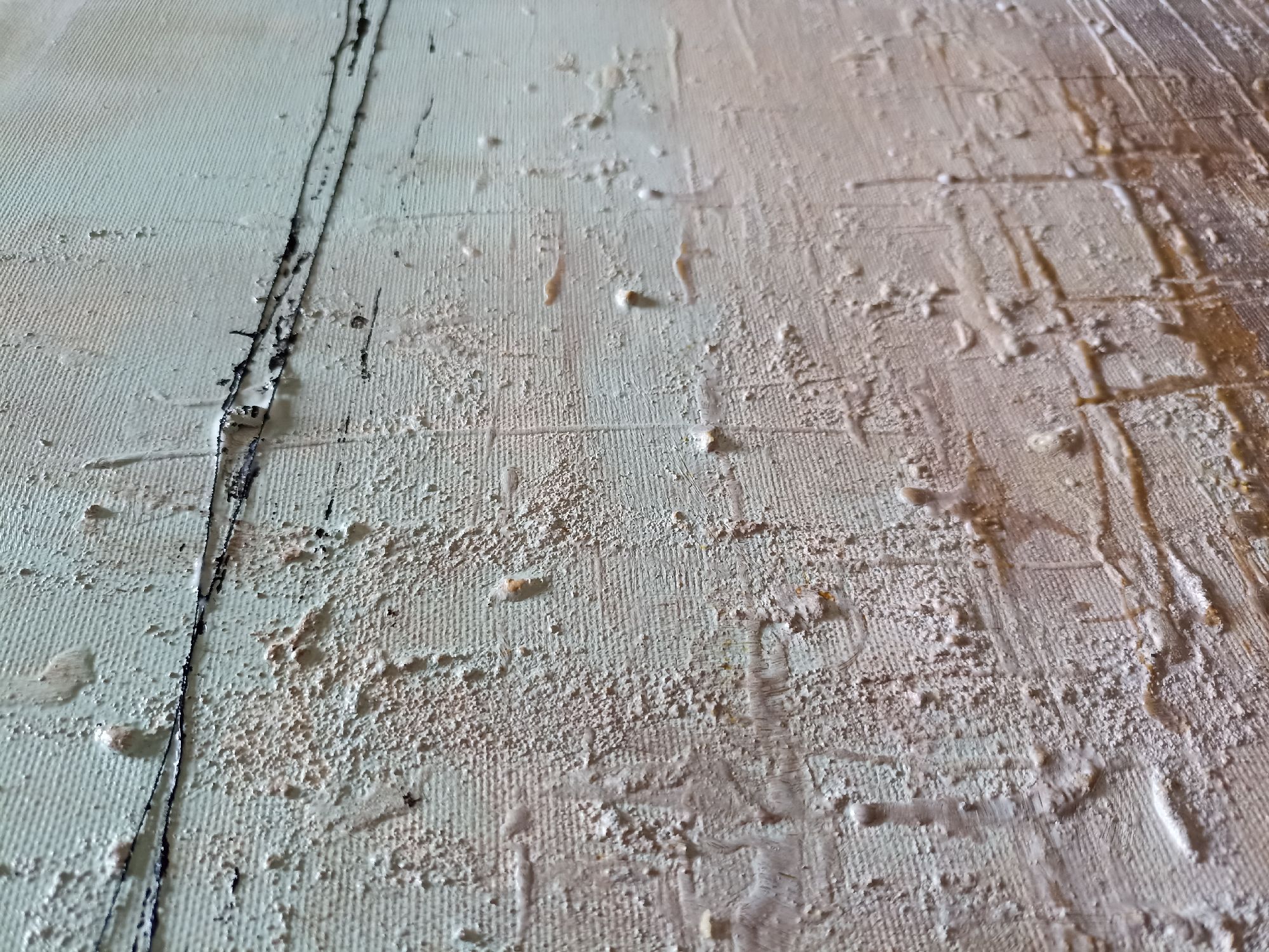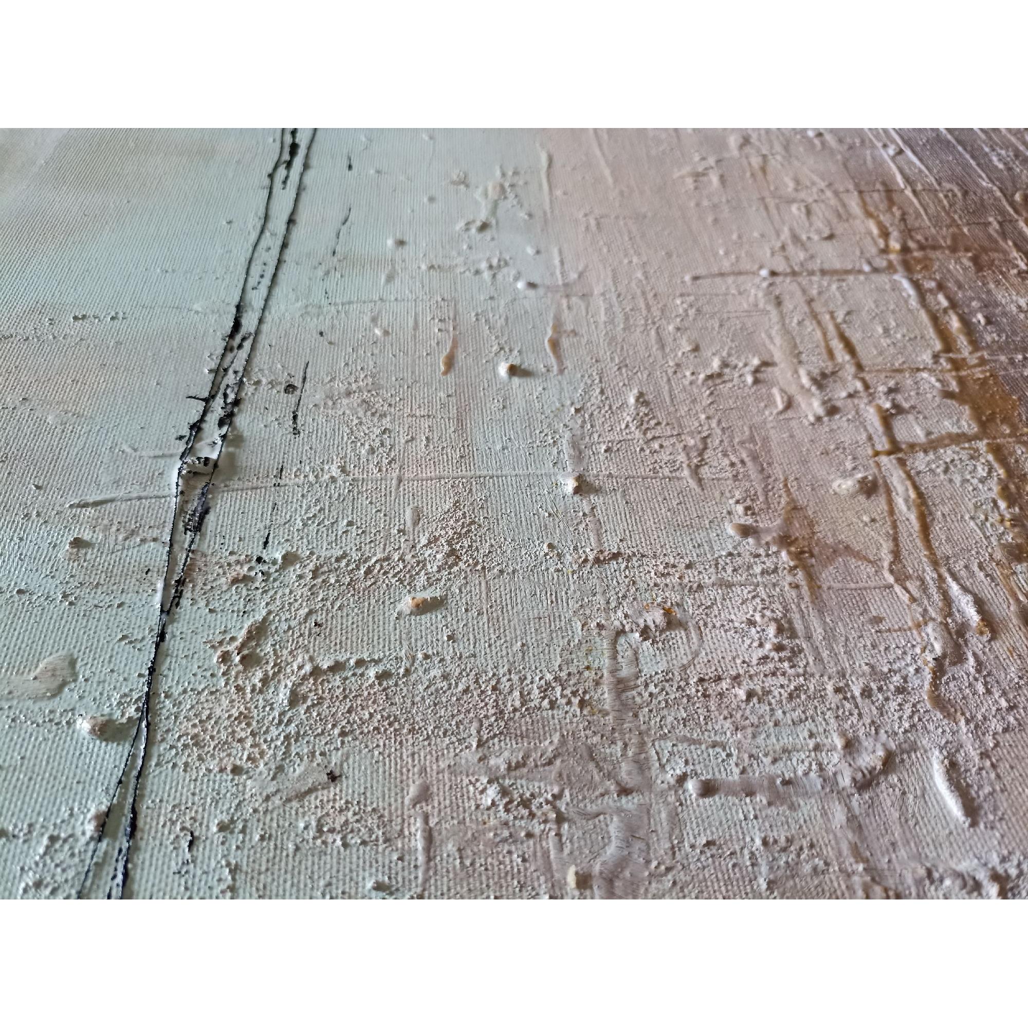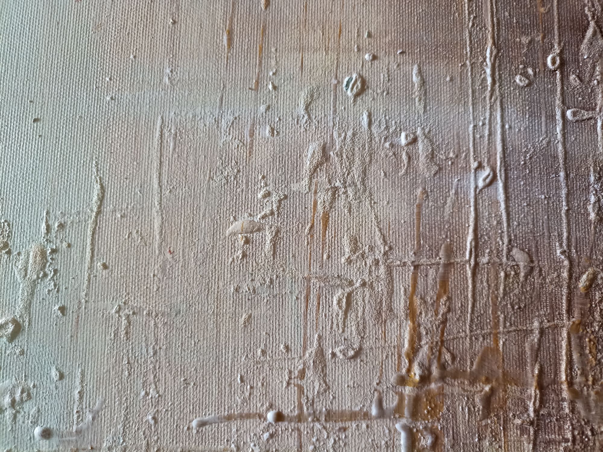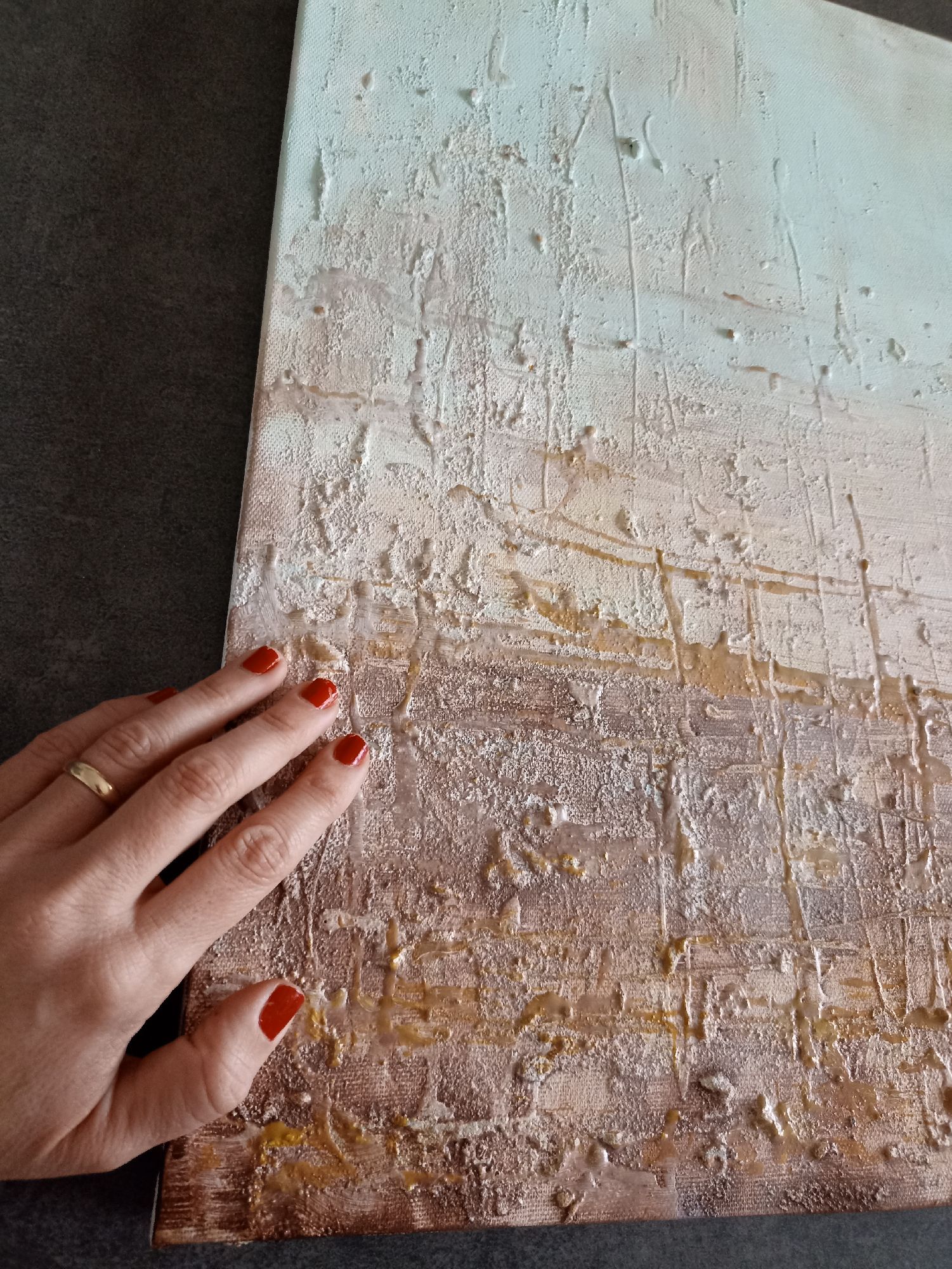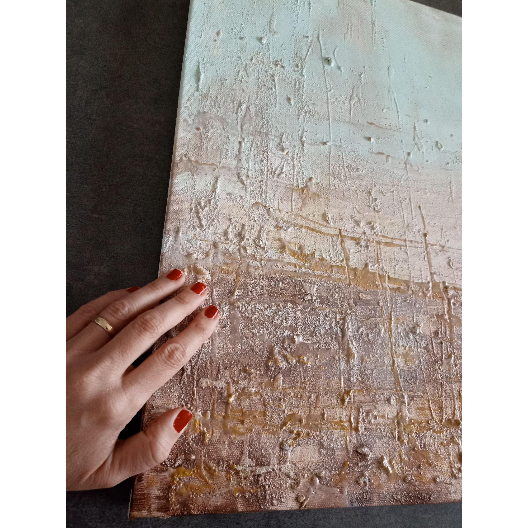 Suggestiva tela dal rilievo materico, tinte marrone/grigio/celeste chiaro. Dipinta nei bordi, non necessita di cornice. Firmata artista veneta.