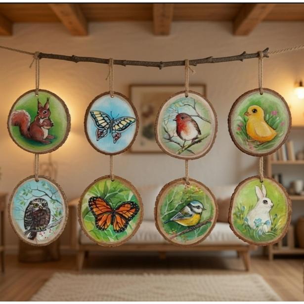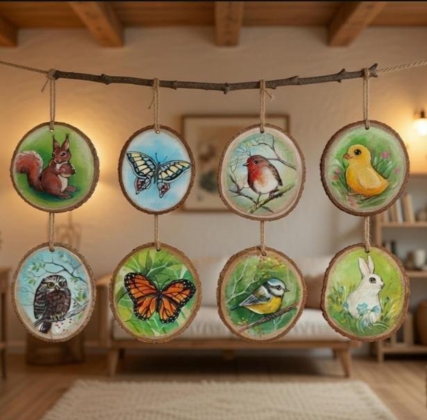 Ciondoli dipinti a mano su legno naturale, con spago e biglietto artista. Da appendere o usare come segnaposto in tavola.Soggetti vari. Euro 10 l' uno.