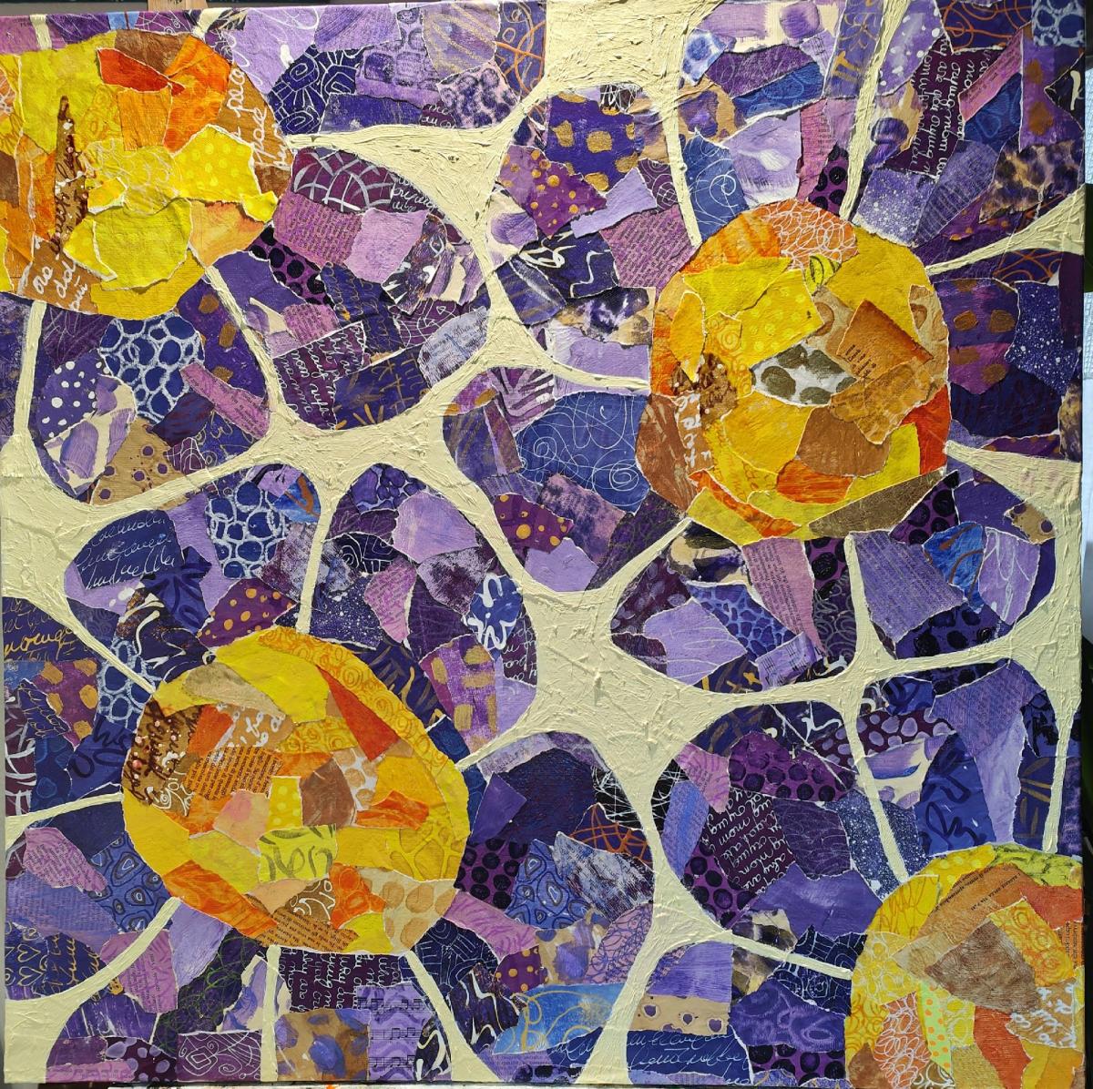 Il quadro è creato con carte dipinte da me ed incollate a strati per dare un idea di materico. Il fondo avorio è dipinto con acrilico