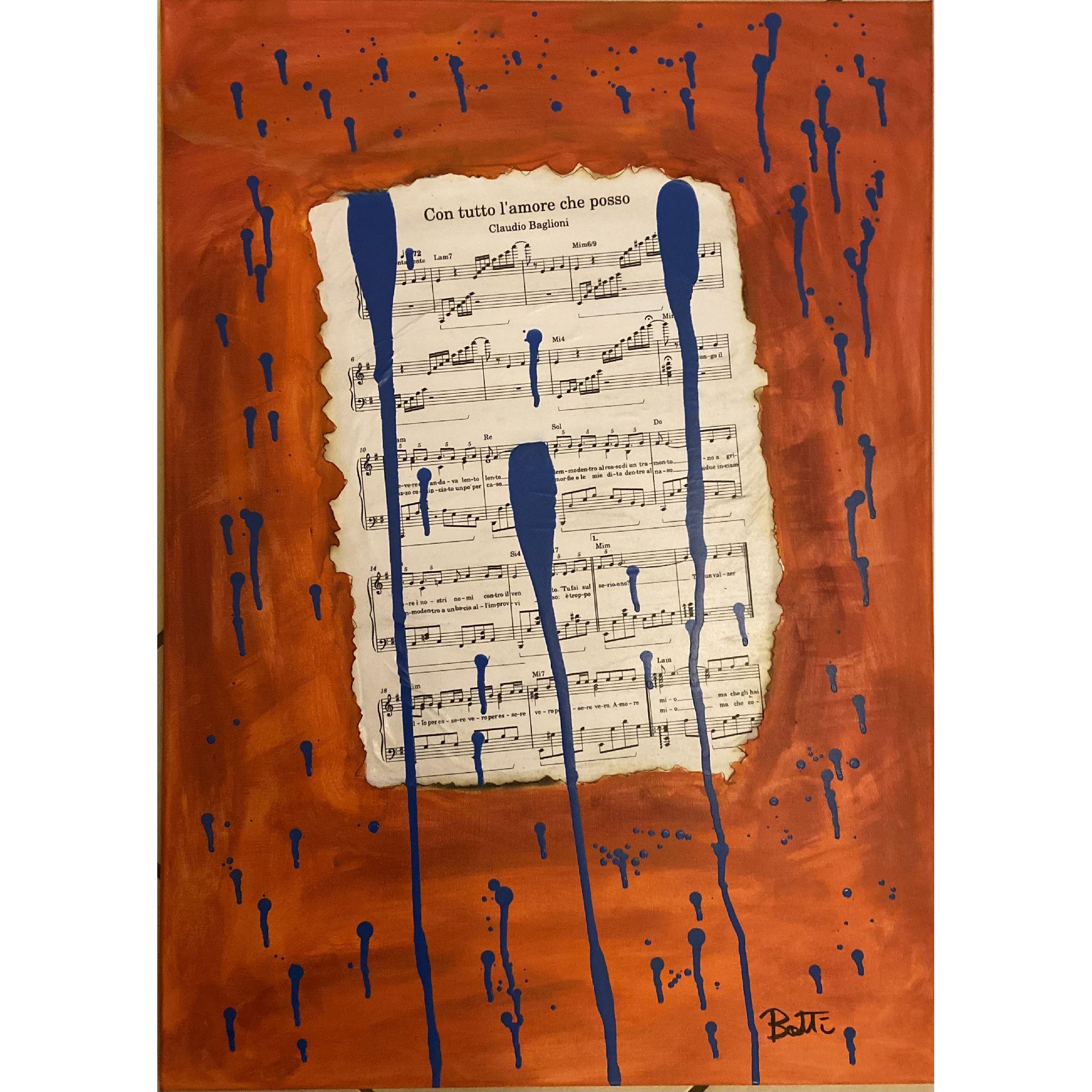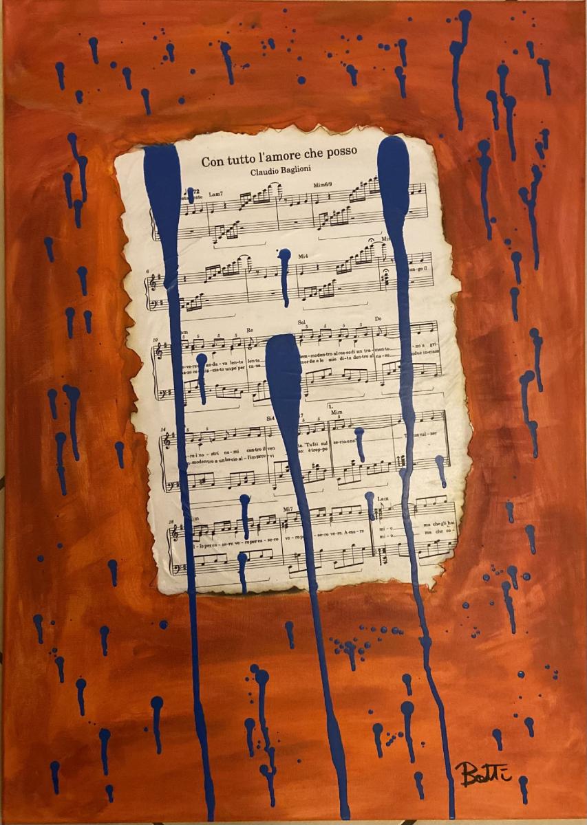 “Gocce di Tevere” è un mio quadro collage, che nasce dall’immagine di uno spartito di Claudio Baglioni“Con tutto l’amore che posso “bruciato sui lati direttamente sulla tela, come un vecchio ricordo consumato dal tempo e che ha dato dolore come una bruciatura sul cuore.