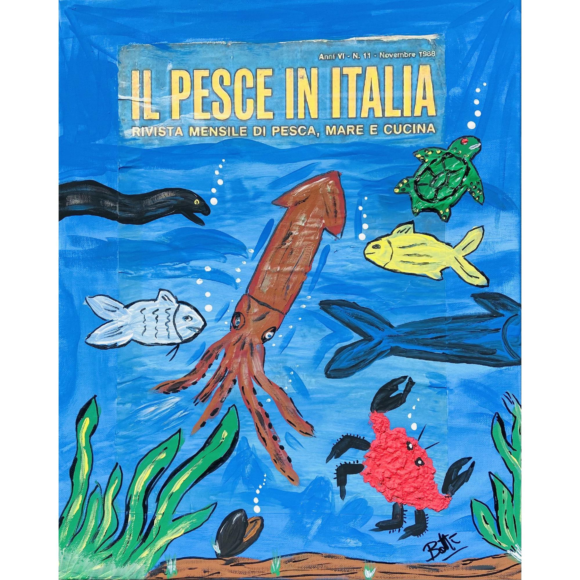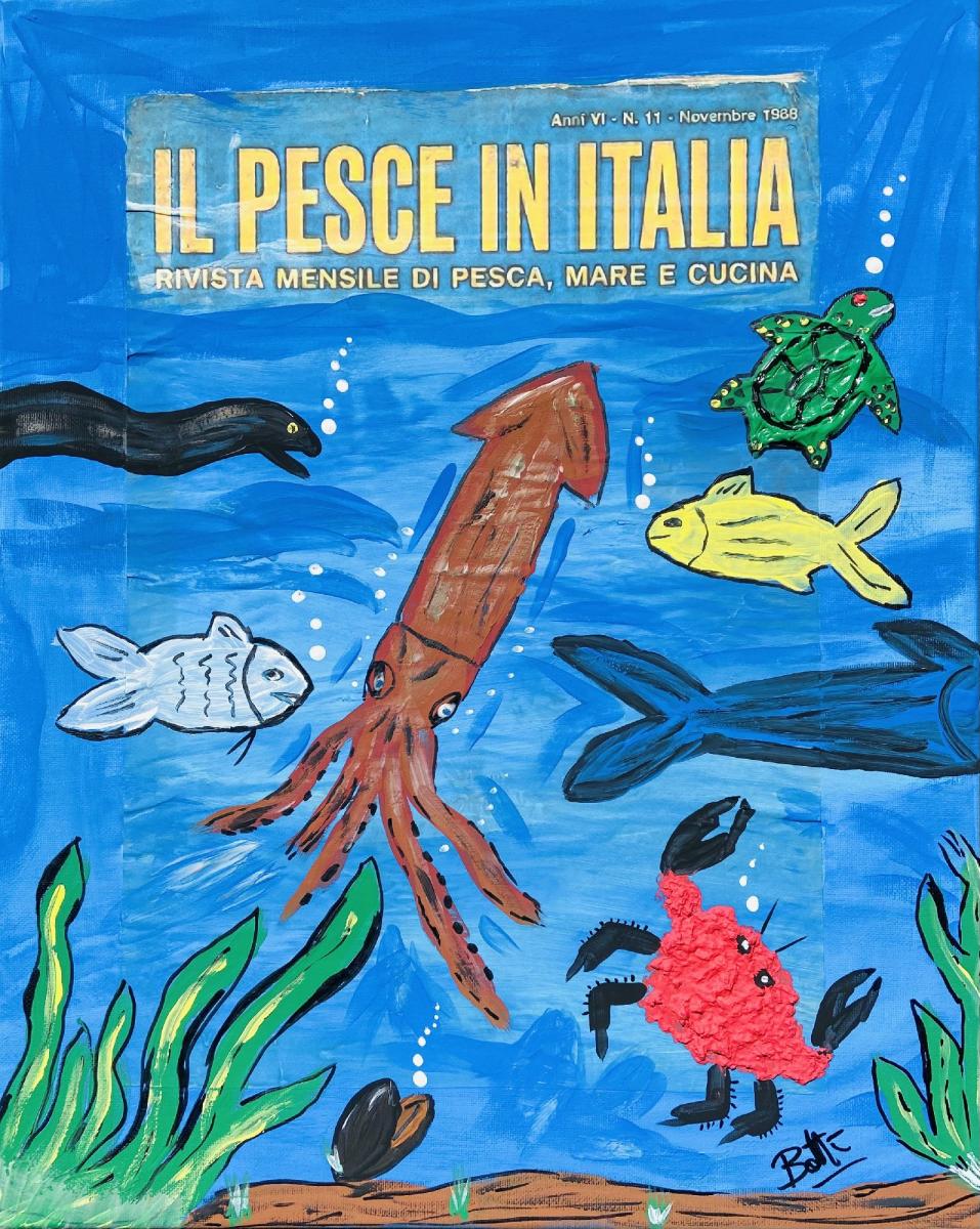 Quest'opera di Cristian Battista (Batti’) immerge lo spettatore in un vivace fondale marino. Al centro, un calamaro bruno domina la scena, circondato da una variegata fauna acquatica: un'anguilla nera, una tartaruga verde, pesci gialli e bianchi, e un granchio rosso dalla texture marcata. Alghe verdi e una conchiglia popolano il fondale sabbioso, mentre bolle d'aria salgono verso la superficie blu. In alto, un frammento di copertina di una rivista "IL PESCE IN ITALIA" del novembre 1988 aggiunge un tocco narrativo. La composizione è dinamica e ricca di dettagli, con la firma dell'artista ben visibile.