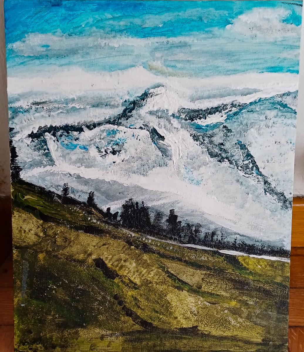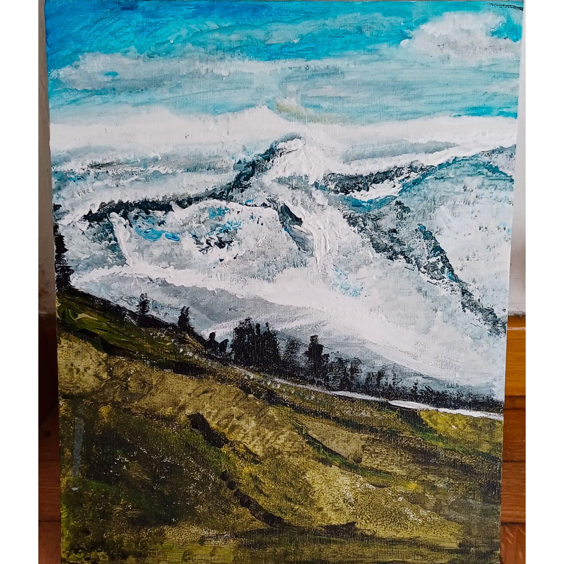 Un' opera che cattura maestosità delle montagne innevate immerse nel verde, le cime; avvolte da nuvole leggere, emergono con forza e delicatezza allo stesso tempo creando un contrasto affascinante con il paesaggio dorato in primo piano.Le pennellate materiche danno profondità e movimento, mentre i toni freddi del cielo e della neve si fondono armoniosamente con i colori autunnali della terra, evocando un senso di pace ed infinito.