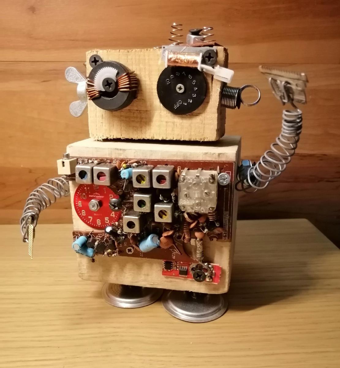 Robot realizzato con materiali di recupero, legno, e una vecchia radio