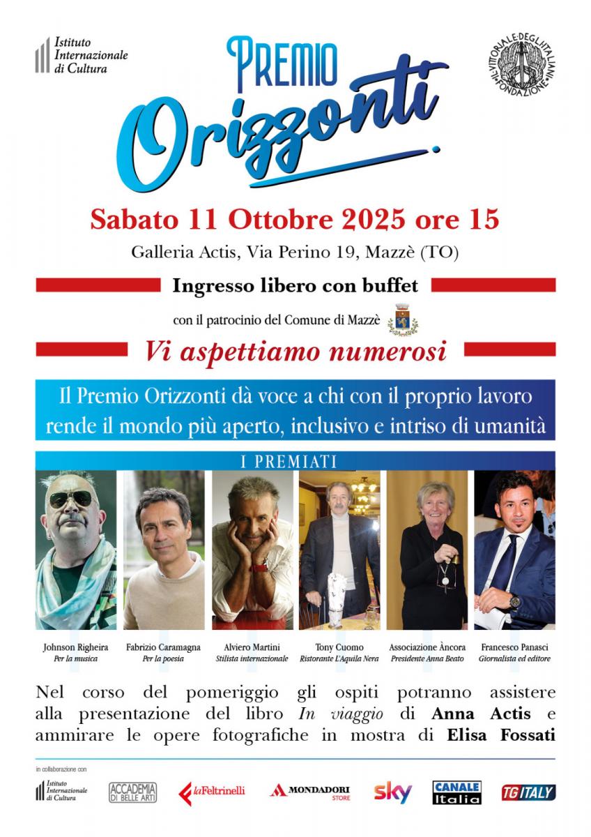 Sabato 11 ottobre,alle ore 15.00, presso lo Spazio Culturale Actis di Mazzè, si terrà lacerimonia di consegna del Premio Orizzonti, riconoscimento che celebrachi, con arte, poesia, creatività o impegno sociale, contribuisce ad ampliare iconfini culturali e umani.