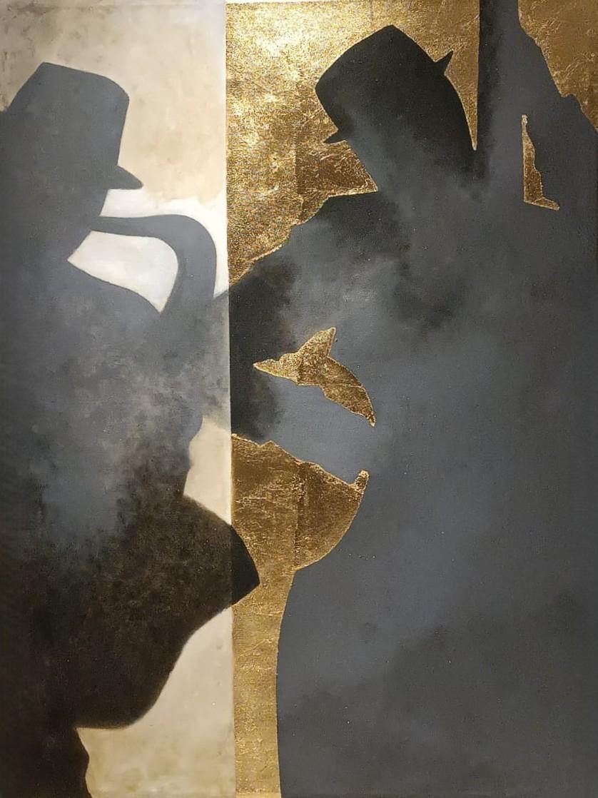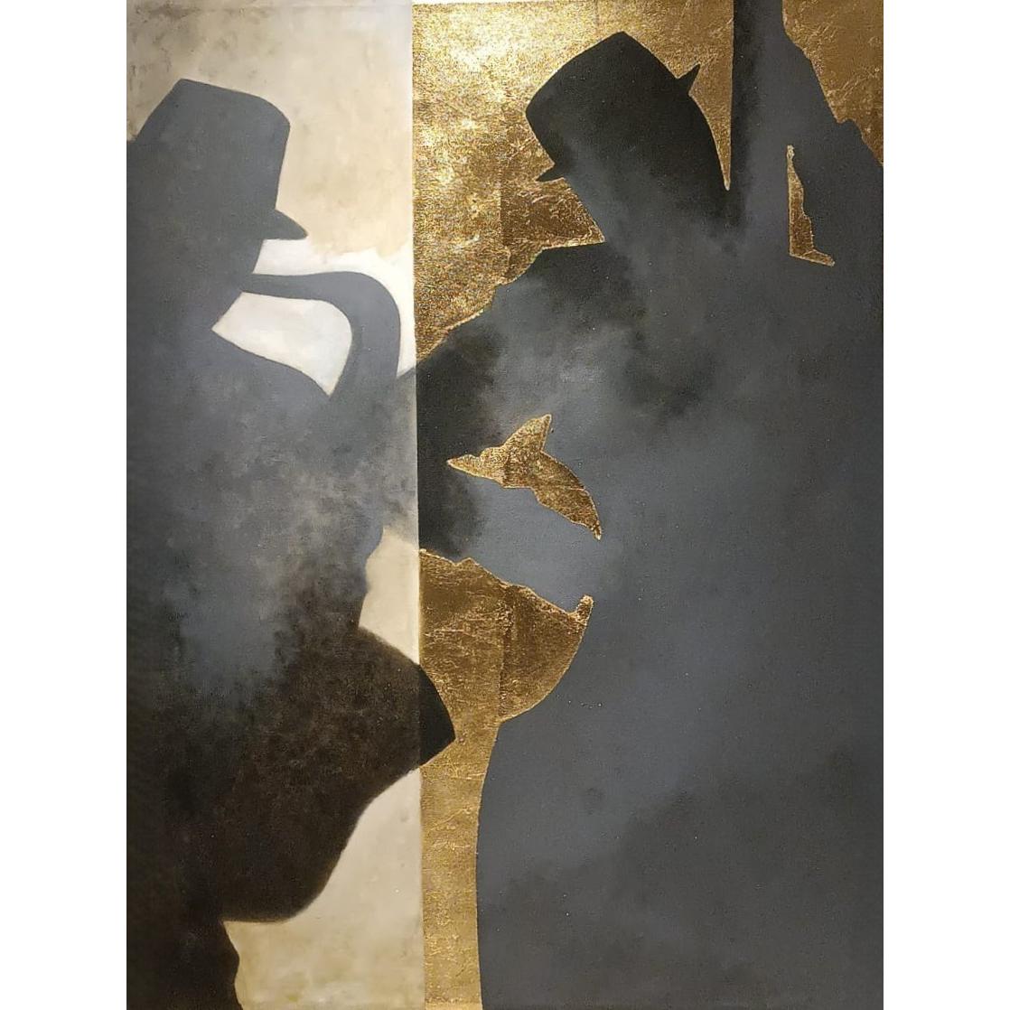 Il quadro è divisoverticalmente in due sezioni principali, sebbene i confini tra di esse sianosfumati e organici: A sinistra domina una tonalità chiara, color crema oavorio, con sfumature ambrate che suggeriscono una luce soffusa ol'ingiallimento della carta antica. Su questo fondo si staglia la silhouettescura di un sassofonista di profilo. A destra la scena si scuriscesensibilmente. In questa sezione appare la sagoma di un secondo musicista, uncontrabbassista su fondo oro. I musicisti sono solo ombre senza volto, i trattidel viso o i dettagli degli strumenti non sono definiti, lasciando che sia lospettatore a completare l'immagine con l'immaginazione. Non sono "dueuomini che suonano", ma è Il Jazz in persona. Rappresenta uno di queimomenti in cui la musica è così coinvolgente che le persone quasi svaniscono,quando si ascolta la musica ad occhi chiusi lasciando spazio solo alle note.