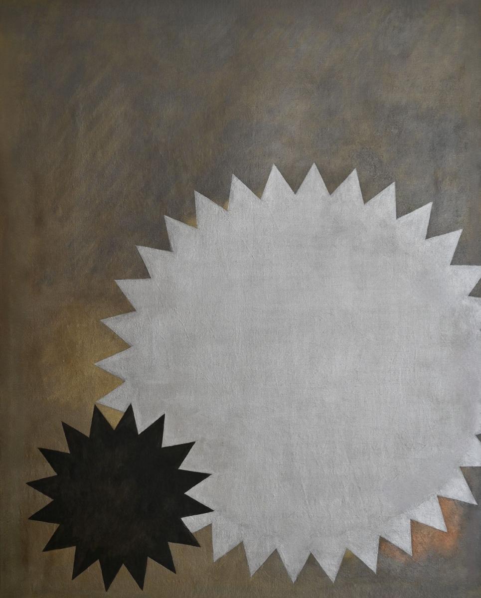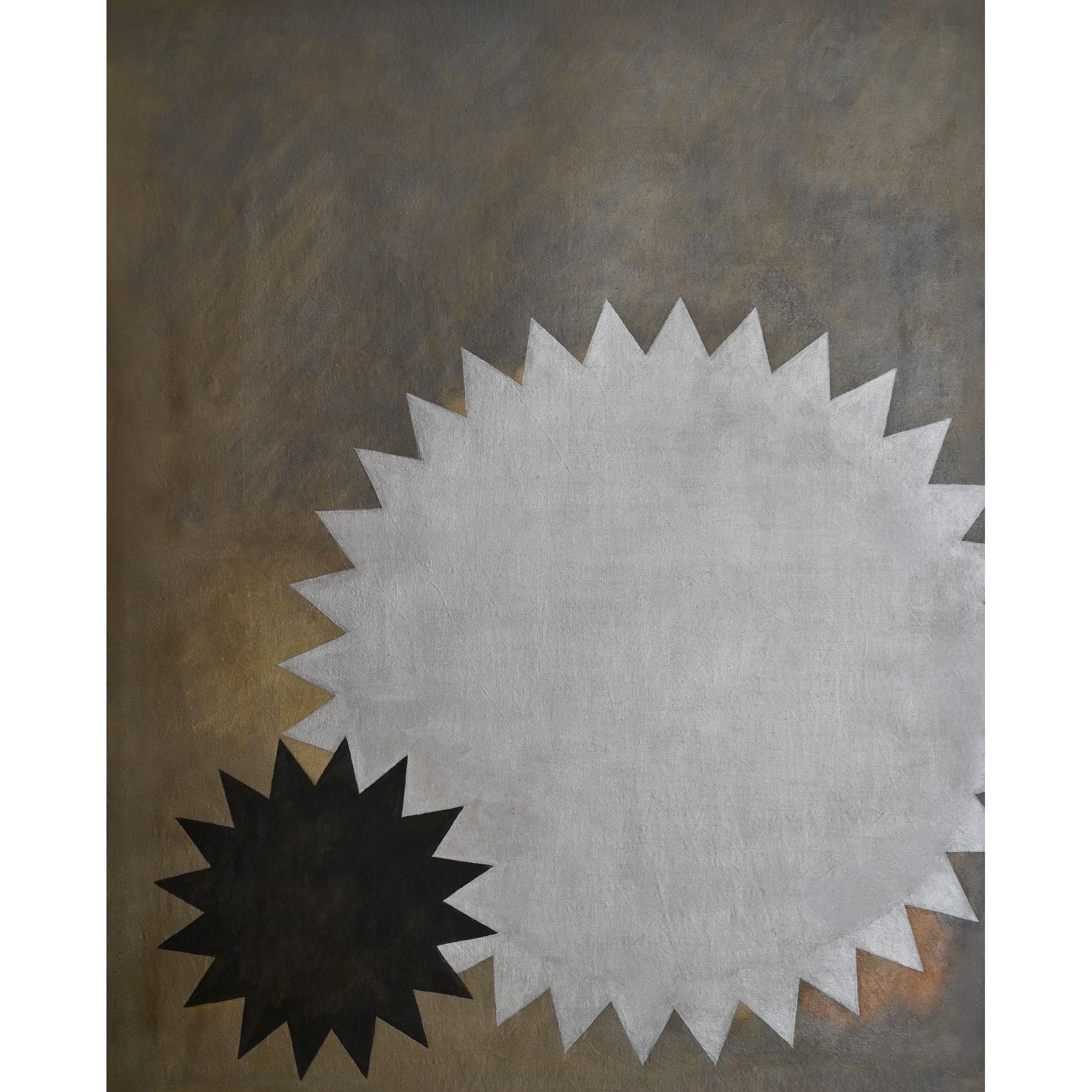 Due astri geometrici danzano in un cielo di polvere e nebbia. Il più grande,un sole d’argento dai bordi taglienti, reclama lo spazio con la sua lucegelida, mentre un’ombra piccola e scura sorge dal basso, come un’eclissisilenziosa che cerca il suo posto nel vuoto. È un incontro tra il rigore dellaforma e l’anima inquieta del colore: dove le punte feriscono il fondo bruno,nasce un’energia vibrante, un battito visivo che trasforma la tela nelpalcoscenico di un conflitto eterno tra luce e oscurità.