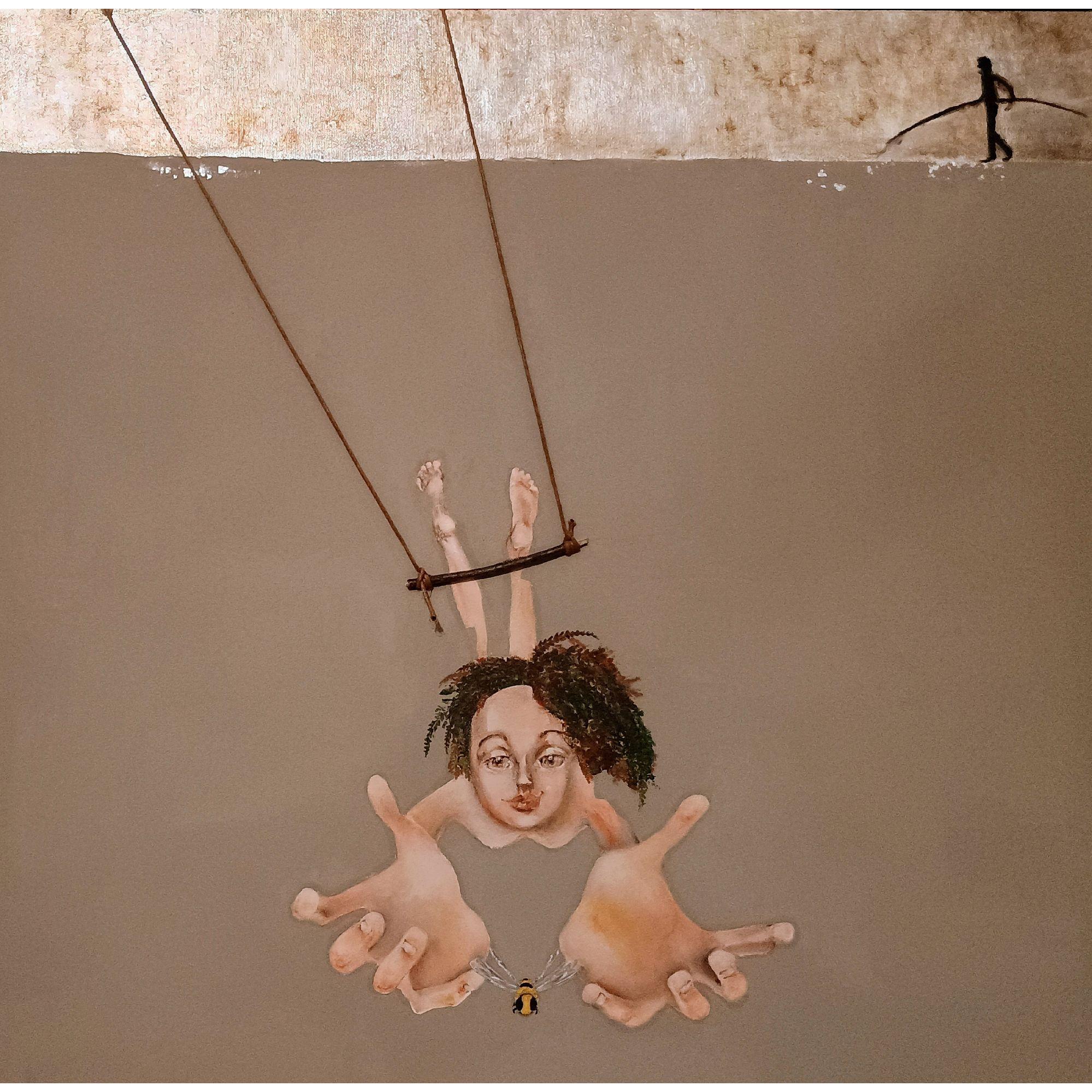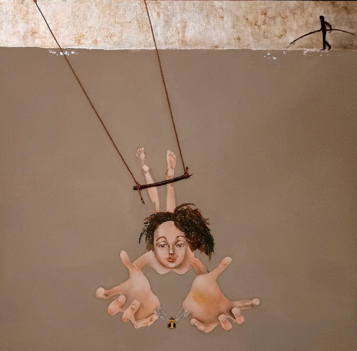 In un mondo grigio cerchiamo nuovi equilibri , la trapezista ci manda un messaggio di speranza lanciando un' ape in volo verso chi la sta guardando
