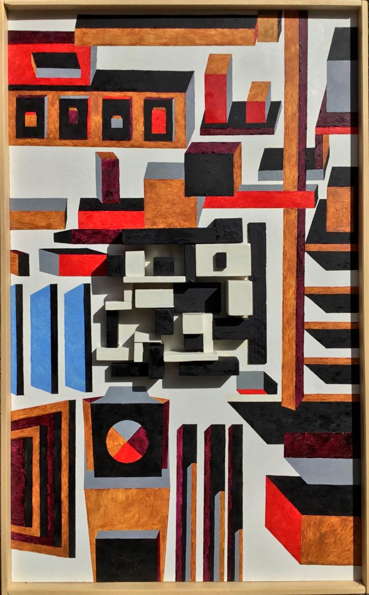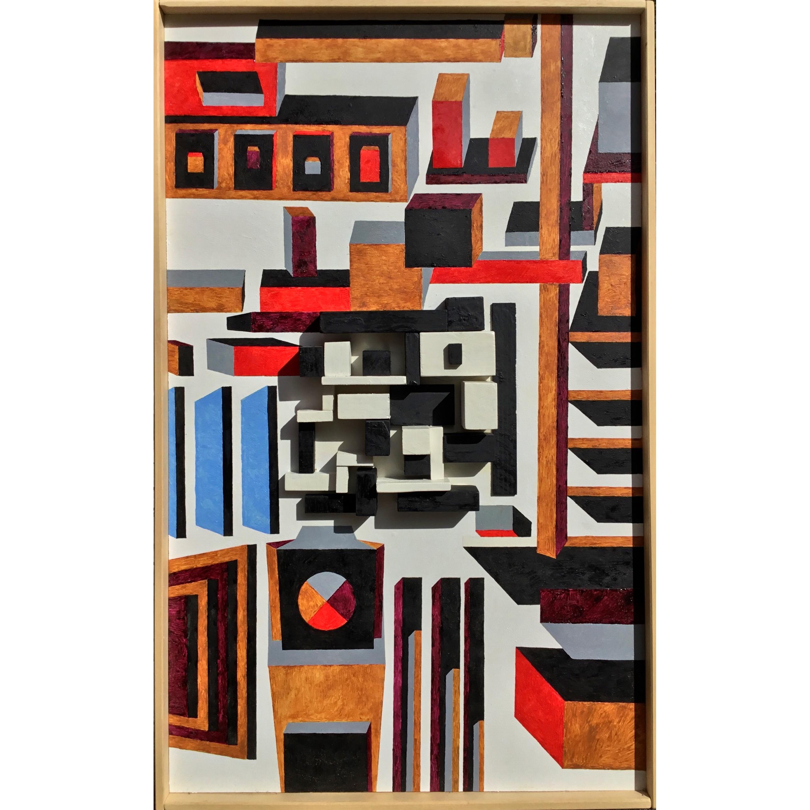 Il centro dell'opera presenta pezzi di legno dipinti di nero o di bianco incollati allo sfondo bianco. Ai lati ho dipinto proiezioni di forme geometriche colorate.Una ricerca di incastri e forme.