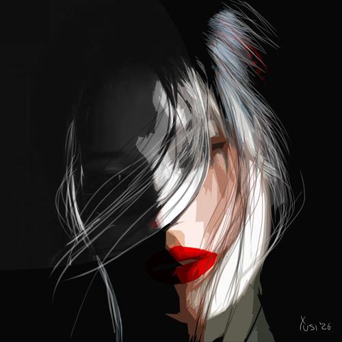 L'immagine è prevalentemente monocromatica (nero, bianco e sfumature di grigio), il che rende l'unico tocco di “rosso vibrante” sulle labbra il punto focale dell'intera opera.