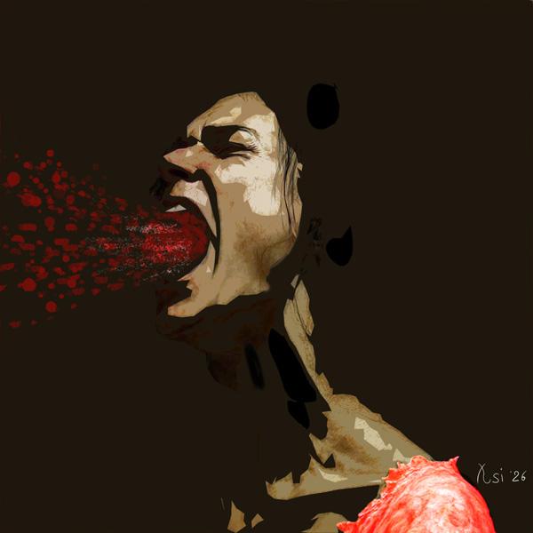 Lo sfondo è di un marrone scurissimo, quasi nero, che fa risaltare i toni caldi della pelle. Il “rosso vibrante” è il protagonista assoluto: appare sia nello spruzzo che esce dalla bocca, sia in una massa realistica nell'angolo in basso a destra, che richiama l'aspetto della carne viva o di un tessuto organico.