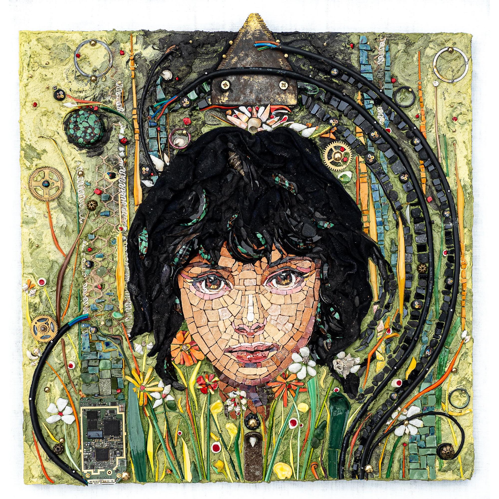 In PrimaVERA, Ylenia Roma celebra la rinascita come incontro tra natura e tecnologia.Il volto emerge da un intreccio di fiori, circuiti e frammenti di materia, suggerendo un equilibrio possibile tra umano, organico e artificiale.L’artista trasforma materiali di scarto in energia vitale e colore, dove ogni elemento recuperato diventa parte di un nuovo ciclo creativo e simbolo di rigenerazione.