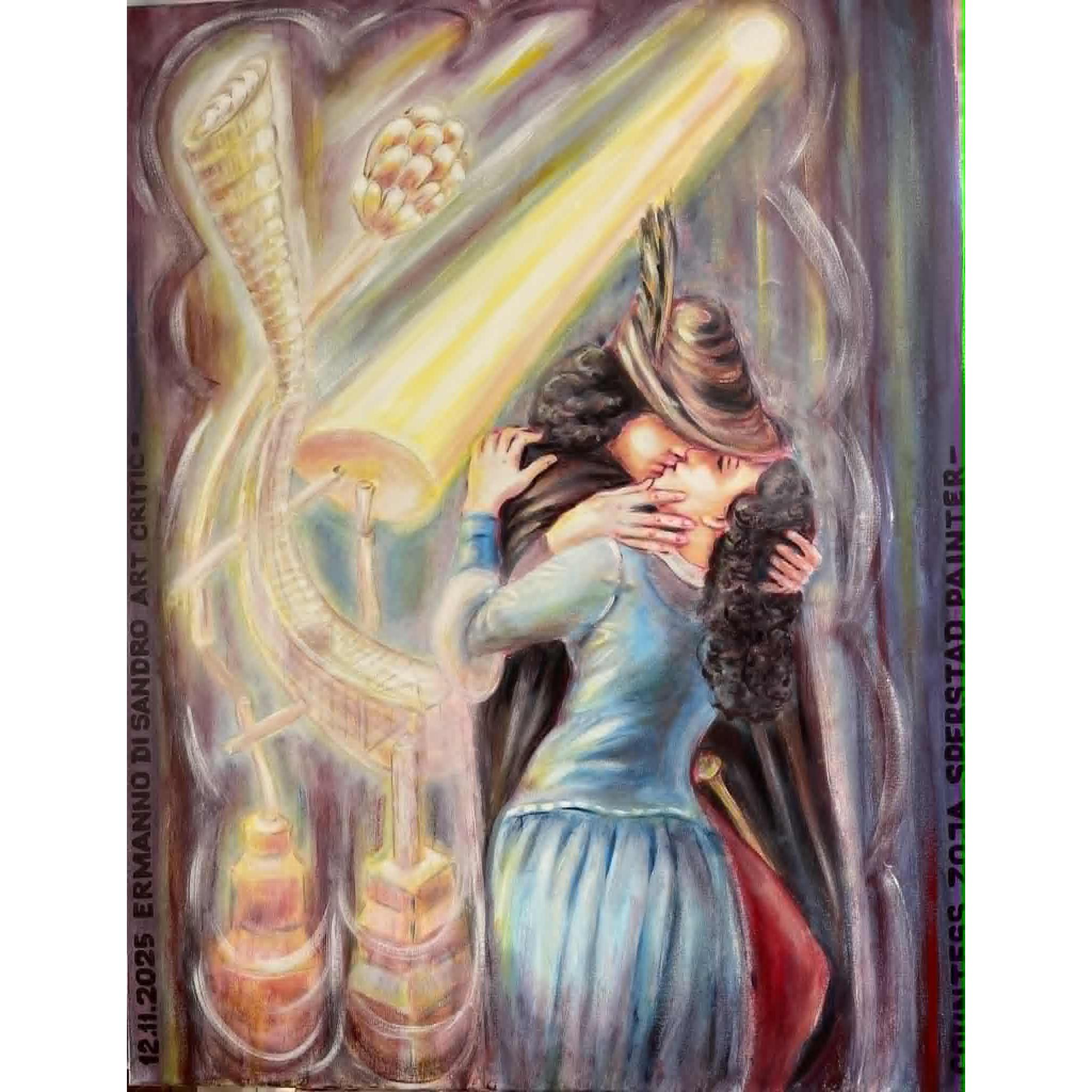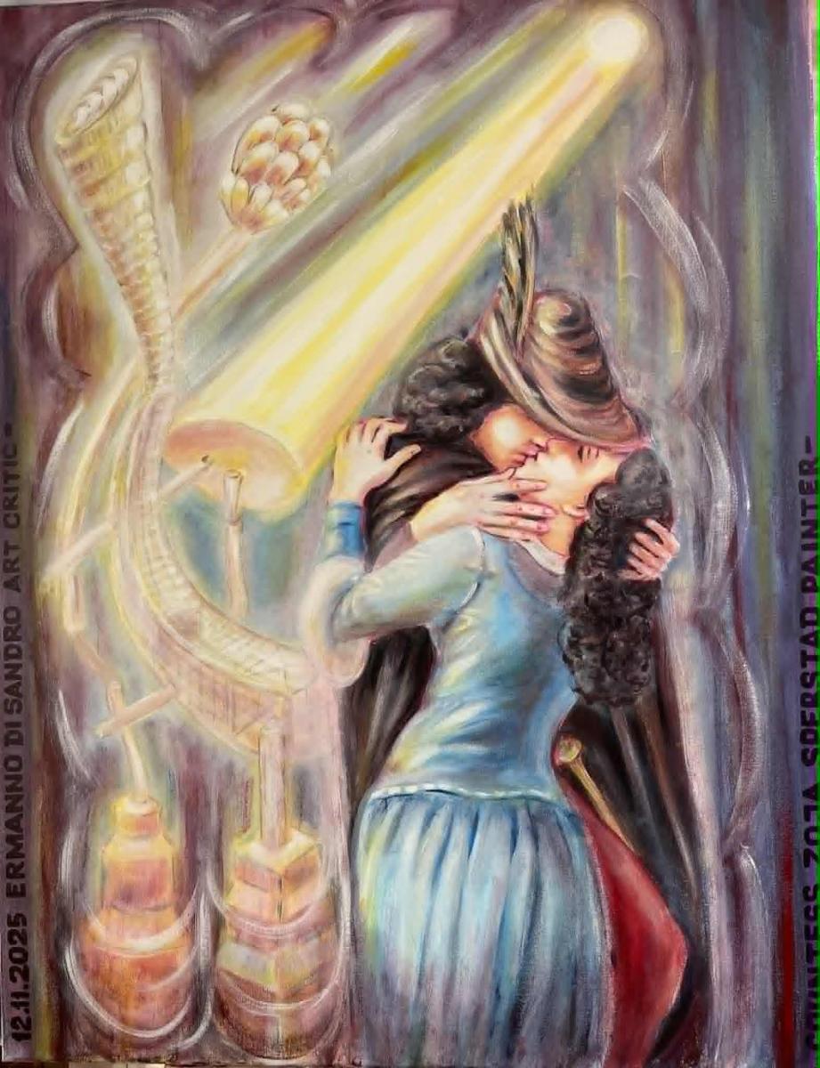 Il disegno riportato in copertina rappresenta un bozzettodel Critico d’Arte Ermanno Di Sandro, il quale sta ispirando una grande Operain acrilico di Zoja Sperstad, Artista internazionale russo-norvegese, cheripropone il famoso “Bacio” di Francesco Hayez, pittore romantico ottocentesco,rivisto in chiave moderna, in una collaborazione, unica al mondo, che avviene acirca 2.250 chilometri di distanza in linea d’aria tra Caserta ed Oslo. Ilbozzetto a penna del Di Sandro fu redatto nervosamente durante una telefonatatra i due protagonisti del 5 novembre scorso, in cui si discuteva delle sortidel mondo sempre più in crisi d’identità e volgarizzato, e nella psiche diErmanno forse era una sorta di gigantesco vortice-aspirapolvere (secondol’interpretazione della Sperstad) che facesse “piazzapulita” di tutte le persone negative, ipocrite, avide e crudeli del mondointero. L’opera fa parte del neonato Movimento fondato da loro due, ovvero il“Neo Espressionismo e Realismo Figurativo A.D.
