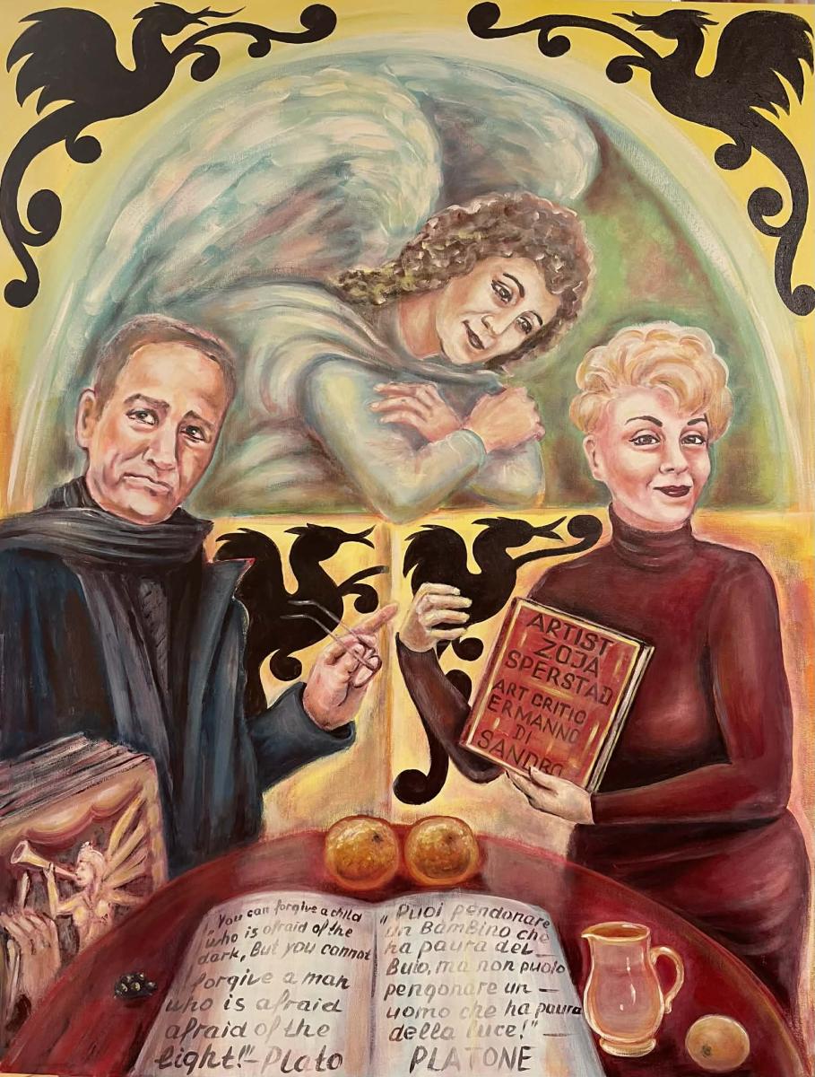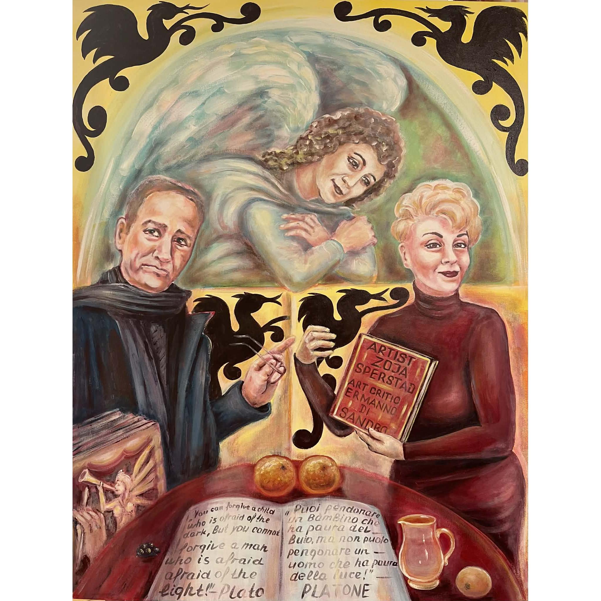 1Botticellisengel, Rublevs treenighet og mine malerier inspirert av Rafael er kombinert iboken med Platons sitat. Men dette er portrettet av den hellige engelen skaptav søster Norma, kunstkritiker Ermanno Di Sandro og kunstneren Zoja Sperstad.116x89,2026, akryl på lerret.